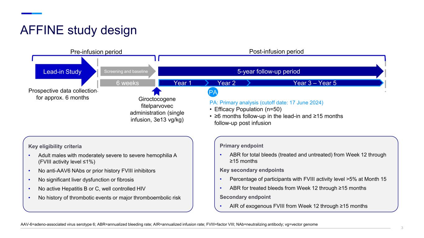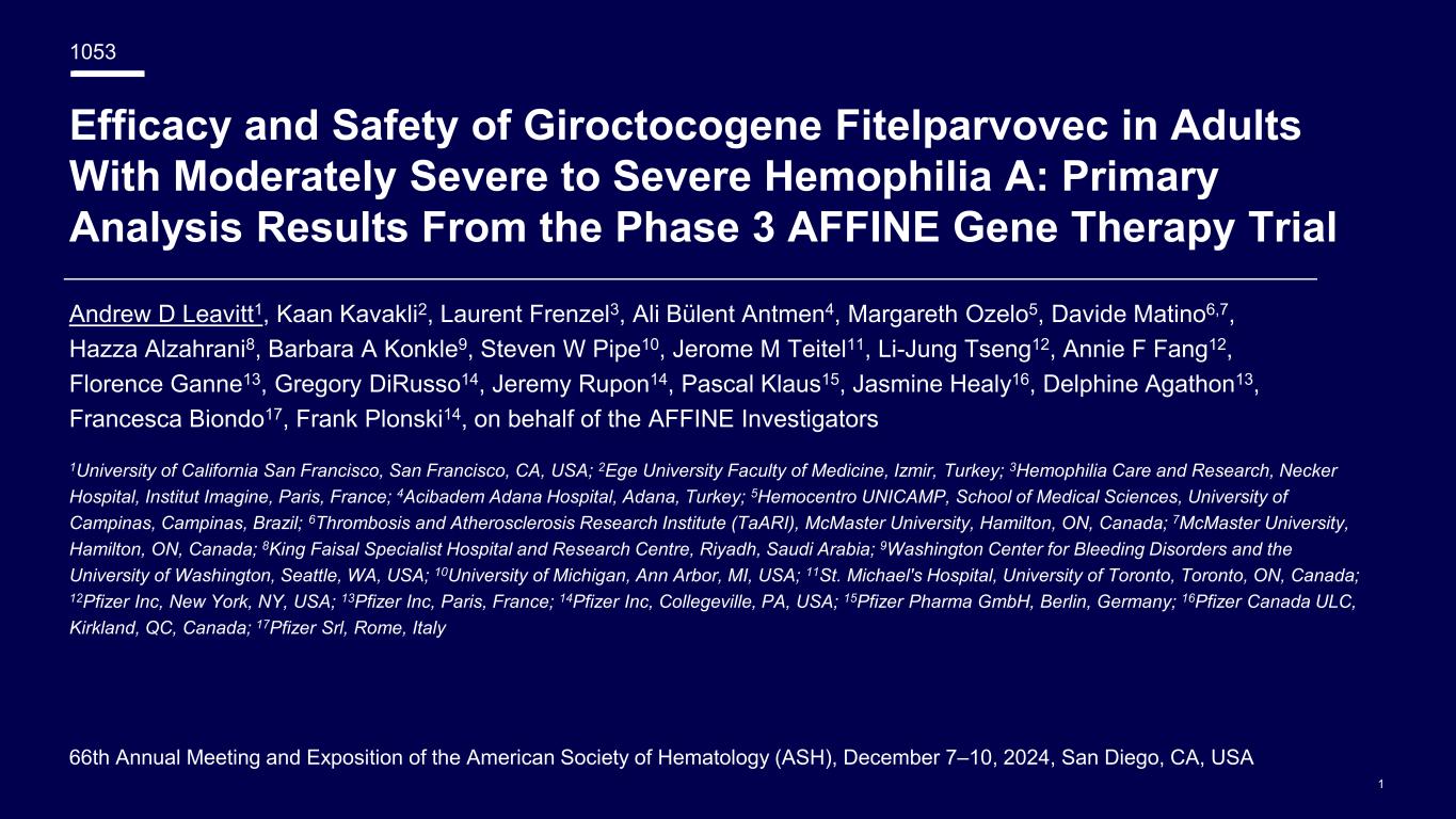 1 1053 Efficacy and Safety of Giroctocogene Fitelparvovec in Adults With Moderately Severe to Severe Hemophilia A: Primary Analysis Results From the Phase 3 AFFINE Gene Therapy Trial Andrew D Leavitt1, Kaan Kavakli2, Laurent Frenzel3, Ali Bülent Antmen4, Margareth Ozelo5, Davide Matino6,7, Hazza Alzahrani8, Barbara A Konkle9, Steven W Pipe10, Jerome M Teitel11, Li-Jung Tseng12, Annie F Fang12, Florence Ganne13, Gregory DiRusso14, Jeremy Rupon14, Pascal Klaus15, Jasmine Healy16, Delphine Agathon13, Francesca Biondo17, Frank Plonski14, on behalf of the AFFINE Investigators 1University of California San Francisco, San Francisco, CA, USA; 2Ege University Faculty of Medicine, Izmir, Turkey; 3Hemophilia Care and Research, Necker Hospital, Institut Imagine, Paris, France; 4Acibadem Adana Hospital, Adana, Turkey; 5Hemocentro UNICAMP, School of Medical Sciences, University of Campinas, Campinas, Brazil; 6Thrombosis and Atherosclerosis Research Institute (TaARI), McMaster University, Hamilton, ON, Canada; 7McMaster University, Hamilton, ON, Canada; 8King Faisal Specialist Hospital and Research Centre, Riyadh, Saudi Arabia; 9Washington Center for Bleeding Disorders and the University of Washington, Seattle, WA, USA; 10University of Michigan, Ann Arbor, MI, USA; 11St. Michael's Hospital, University of Toronto, Toronto, ON, Canada; 12Pfizer Inc, New York, NY, USA; 13Pfizer Inc, Paris, France; 14Pfizer Inc, Collegeville, PA, USA; 15Pfizer Pharma GmbH, Berlin, Germany; 16Pfizer Canada ULC, Kirkland, QC, Canada; 17Pfizer Srl, Rome, Italy 66th Annual Meeting and Exposition of the American Society of Hematology (ASH), December 7–10, 2024, San Diego, CA, USA