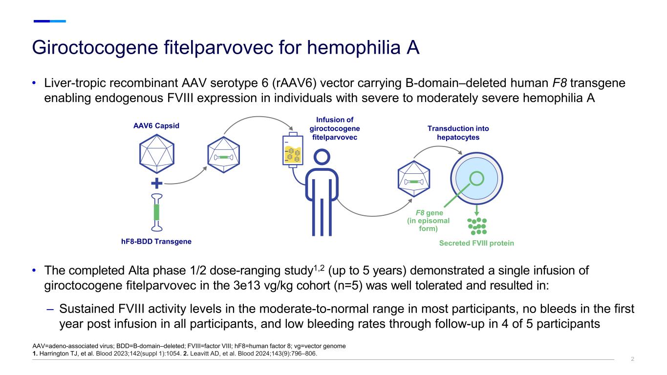 22 • Liver-tropic recombinant AAV serotype 6 (rAAV6) vector carrying B-domain–deleted human F8 transgene enabling endogenous FVIII expression in individuals with severe to moderately severe hemophilia A • The completed Alta phase 1/2 dose-ranging study1,2 (up to 5 years) demonstrated a single infusion of giroctocogene fitelparvovec in the 3e13 vg/kg cohort (n=5) was well tolerated and resulted in: – Sustained FVIII activity levels in the moderate-to-normal range in most participants, no bleeds in the first year post infusion in all participants, and low bleeding rates through follow-up in 4 of 5 participants Giroctocogene fitelparvovec for hemophilia A AAV=adeno-associated virus; BDD=B-domain–deleted; FVIII=factor VIII; hF8=human factor 8; vg=vector genome 1. Harrington TJ, et al. Blood 2023;142(suppl 1):1054. 2. Leavitt AD, et al. Blood 2024;143(9):796–806. AAV6 Capsid Secreted FVIII protein F8 gene (in episomal form) hF8-BDD Transgene Transduction into hepatocytes Infusion of giroctocogene fitelparvovec