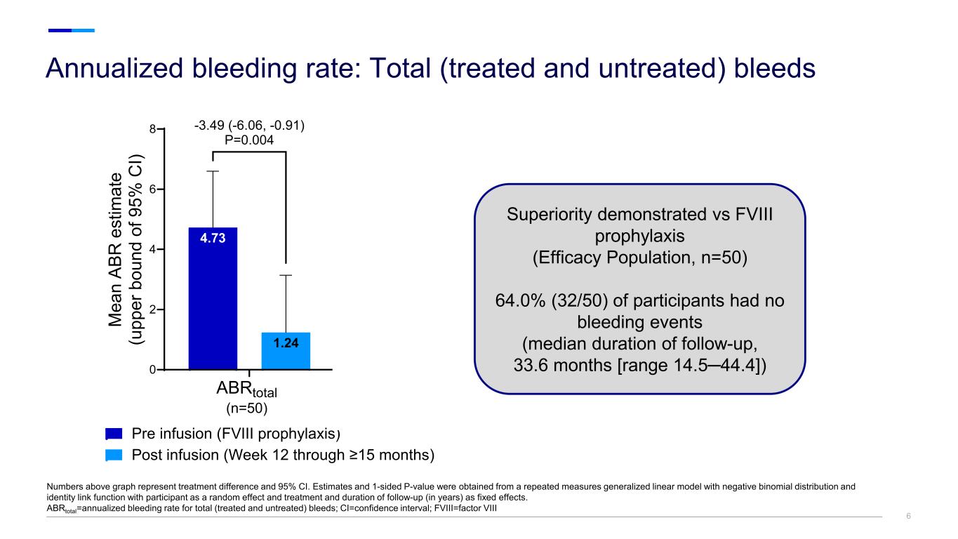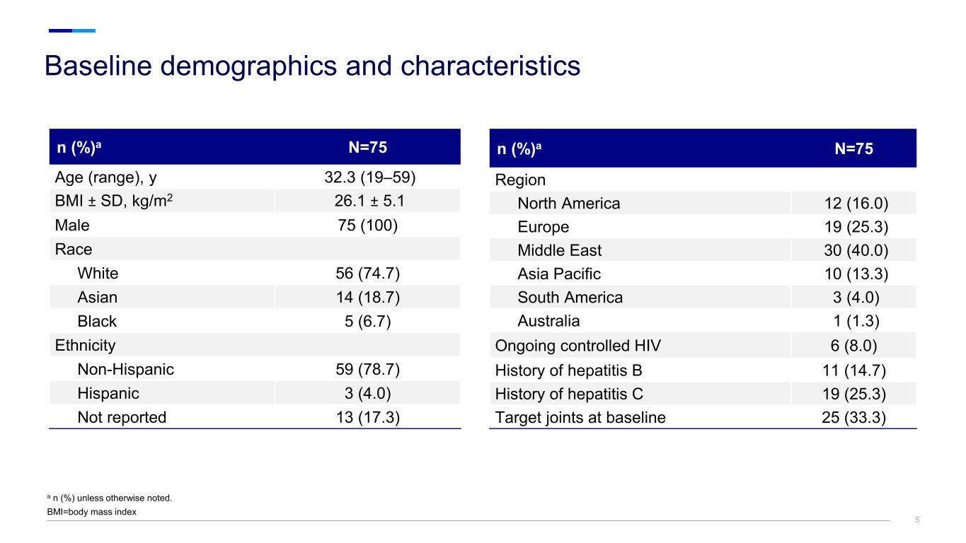 Baseline demographics and characteristics a n (%) unless otherwise noted. BMI=body mass index 5 n (%)a N=75 Region North America 12 (16.0) Europe 19 (25.3) Middle East 30 (40.0) Asia Pacific 10 (13.3) South America 3 (4.0) Australia 1 (1.3) Ongoing controlled HIV 6 (8.0) History of hepatitis B 11 (14.7) History of hepatitis C 19 (25.3) Target joints at baseline 25 (33.3) n (%)a N=75 Age (range), y 32.3 (19–59) BMI ± SD, kg/m2 26.1 ± 5.1 Male 75 (100) Race White 56 (74.7) Asian 14 (18.7) Black 5 (6.7) Ethnicity Non-Hispanic 59 (78.7) Hispanic 3 (4.0) Not reported 13 (17.3)