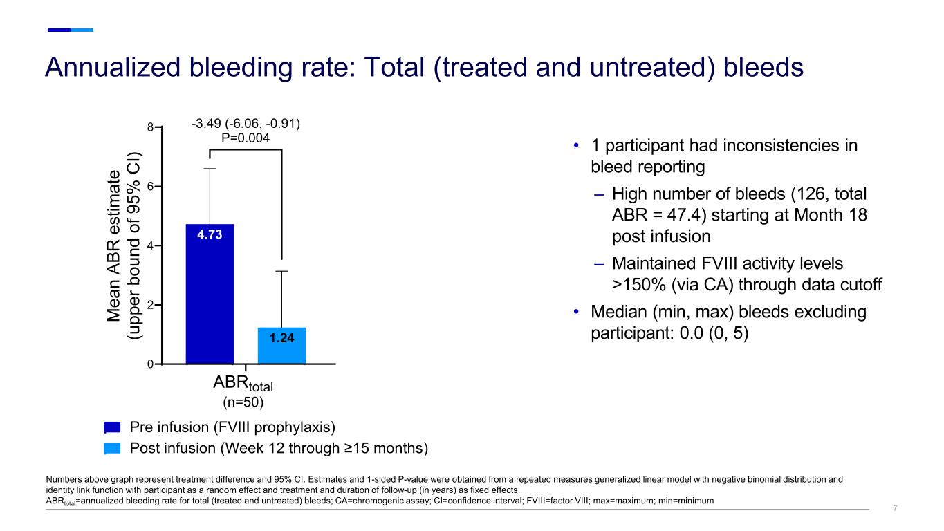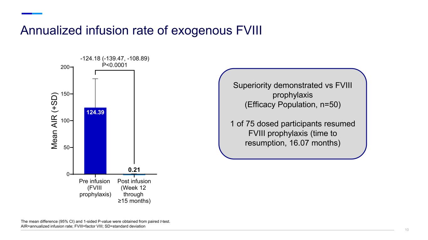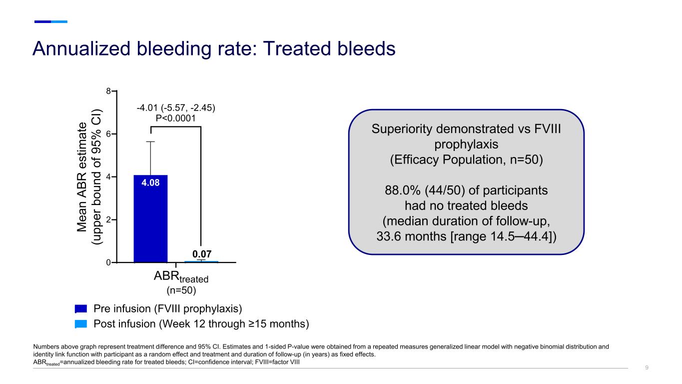 0 2 4 6 8 1.24 4.73 4.65 M ea n AB R e st im at e (u pp er b ou nd o f 9 5% C I) Pre infusion (FVIII prophylaxis) Post infusion (Week 12 through ≥15 months) ABRtotal (n=50) ABRtotal (n=49) -3.49 (-6.06, -0.91) P=0.004 -4.40 (-6.31, -2.48) P<0.0001 0.26 8 Annualized bleeding rate: Total (treated and untreated) bleeds Numbers above graph represent treatment difference and 95% CI. Estimates and 1-sided P-value were obtained from a repeated measures generalized linear model with negative binomial distribution and identity link function with participant as a random effect and treatment and duration of follow-up (in years) as fixed effects. ABRtotal=annualized bleeding rate for total (treated and untreated) bleeds; CI=confidence interval; FVIII=factor VIII Post hoc sensitivity analysis excluding 1 participant (n=49) demonstrated superiority vs FVIII prophylaxis