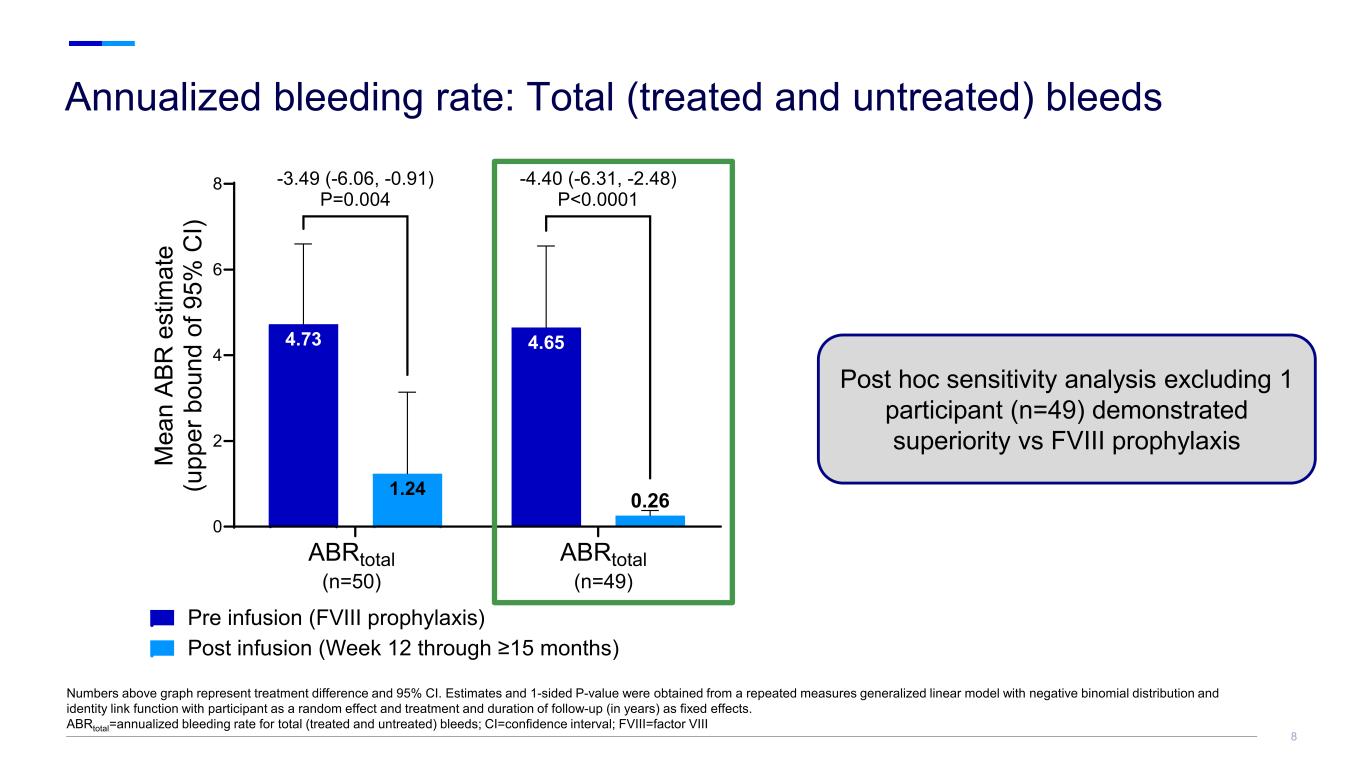 7 0 2 4 6 8 1.24 4.73 4.65 M ea n AB R e st im at e (u pp er b ou nd o f 9 5% C I) Pre infusion (FVIII prophylaxis) Post infusion (Week 12 through ≥15 months) ABRtotal (n=50) ABRtotal (n=49) -3.49 (-6.06, -0.91) P=0.004 -4.40 (-6.31, -2.48) P<0.0001 0.26 7 Annualized bleeding rate: Total (treated and untreated) bleeds Numbers above graph represent treatment difference and 95% CI. Estimates and 1-sided P-value were obtained from a repeated measures generalized linear model with negative binomial distribution and identity link function with participant as a random effect and treatment and duration of follow-up (in years) as fixed effects. ABRtotal=annualized bleeding rate for total (treated and untreated) bleeds; CA=chromogenic assay; CI=confidence interval; FVIII=factor VIII; max=maximum; min=minimum • 1 participant had inconsistencies in bleed reporting – High number of bleeds (126, total ABR = 47.4) starting at Month 18 post infusion – Maintained FVIII activity levels >150% (via CA) through data cutoff • Median (min, max) bleeds excluding participant: 0.0 (0, 5)