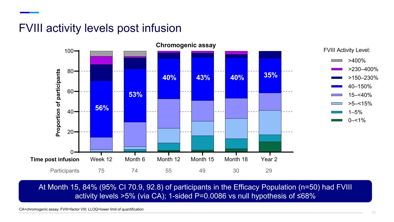 Annualized infusion rate of exogenous FVIII The mean difference (95% CI) and 1-sided P-value were obtained from paired t-test. AIR=annualized infusion rate; FVIII=factor VIII; SD=standard deviation 10 Pre infusion (FVIII prophylaxis) Post infusion (Week 12 through ≥15 months) 0 50 100 150 200 124.39 M ea n AI R (+ SD ) -124.18 (-139.47, -108.89) P<0.0001 0.21 Superiority demonstrated vs FVIII prophylaxis (Efficacy Population, n=50) 1 of 75 dosed participants resumed FVIII prophylaxis (time to resumption, 16.07 months)