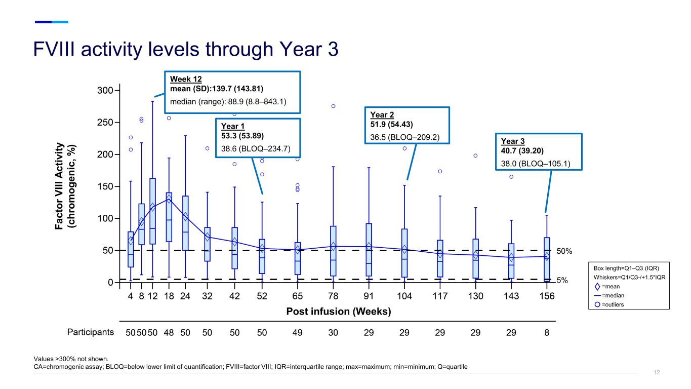 12 FVIII activity levels through Year 3 Values >300% not shown. CA=chromogenic assay; BLOQ=below lower limit of quantification; FVIII=factor VIII; IQR=interquartile range; max=maximum; min=minimum; Q=quartile Fa ct or V III A ct iv ity (c hr om og en ic , % ) Post infusion (Weeks) 50% 5% Year 2 51.9 (54.43) 36.5 (BLOQ–209.2) Year 3 40.7 (39.20) 38.0 (BLOQ–105.1) 12 Week 12 mean (SD):139.7 (143.81) median (range): 88.9 (8.8–843.1) Year 1 53.3 (53.89) 38.6 (BLOQ–234.7) Box length=Q1–Q3 (IQR) Whiskers=Q1/Q3-/+1.5*IQR =mean =median =outliers