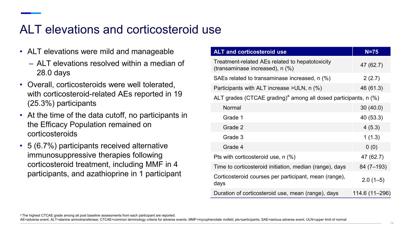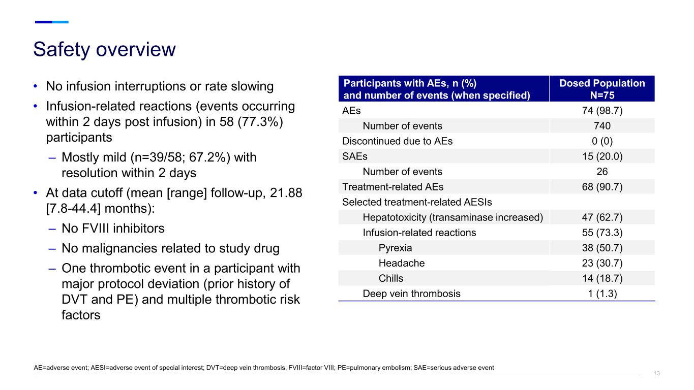 13 • No infusion interruptions or rate slowing • Infusion-related reactions (events occurring within 2 days post infusion) in 58 (77.3%) participants – Mostly mild (n=39/58; 67.2%) with resolution within 2 days • At data cutoff (mean [range] follow-up, 21.88 [7.8-44.4] months): – No FVIII inhibitors – No malignancies related to study drug – One thrombotic event in a participant with major protocol deviation (prior history of DVT and PE) and multiple thrombotic risk factors AE=adverse event; AESI=adverse event of special interest; DVT=deep vein thrombosis; FVIII=factor VIII; PE=pulmonary embolism; SAE=serious adverse event Participants with AEs, n (%) and number of events (when specified) Dosed Population N=75 AEs 74 (98.7) Number of events 740 Discontinued due to AEs 0 (0) SAEs 15 (20.0) Number of events 26 Treatment-related AEs 68 (90.7) Selected treatment-related AESIs Hepatotoxicity (transaminase increased) 47 (62.7) Infusion-related reactions 55 (73.3) Pyrexia 38 (50.7) Headache 23 (30.7) Chills 14 (18.7) Deep vein thrombosis 1 (1.3) Safety overview