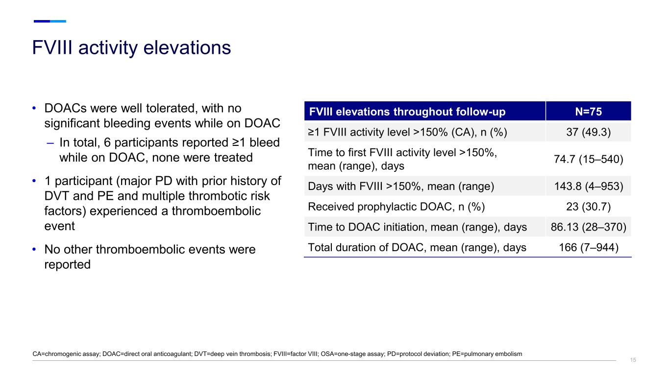 15 • DOACs were well tolerated, with no significant bleeding events while on DOAC – In total, 6 participants reported ≥1 bleed while on DOAC, none were treated • 1 participant (major PD with prior history of DVT and PE and multiple thrombotic risk factors) experienced a thromboembolic event • No other thromboembolic events were reported CA=chromogenic assay; DOAC=direct oral anticoagulant; DVT=deep vein thrombosis; FVIII=factor VIII; OSA=one-stage assay; PD=protocol deviation; PE=pulmonary embolism FVIII elevations throughout follow-up N=75 ≥1 FVIII activity level >150% (CA), n (%) 37 (49.3) Time to first FVIII activity level >150%, mean (range), days 74.7 (15–540) Days with FVIII >150%, mean (range) 143.8 (4–953) Received prophylactic DOAC, n (%) 23 (30.7) Time to DOAC initiation, mean (range), days 86.13 (28–370) Total duration of DOAC, mean (range), days 166 (7–944) FVIII activity elevations