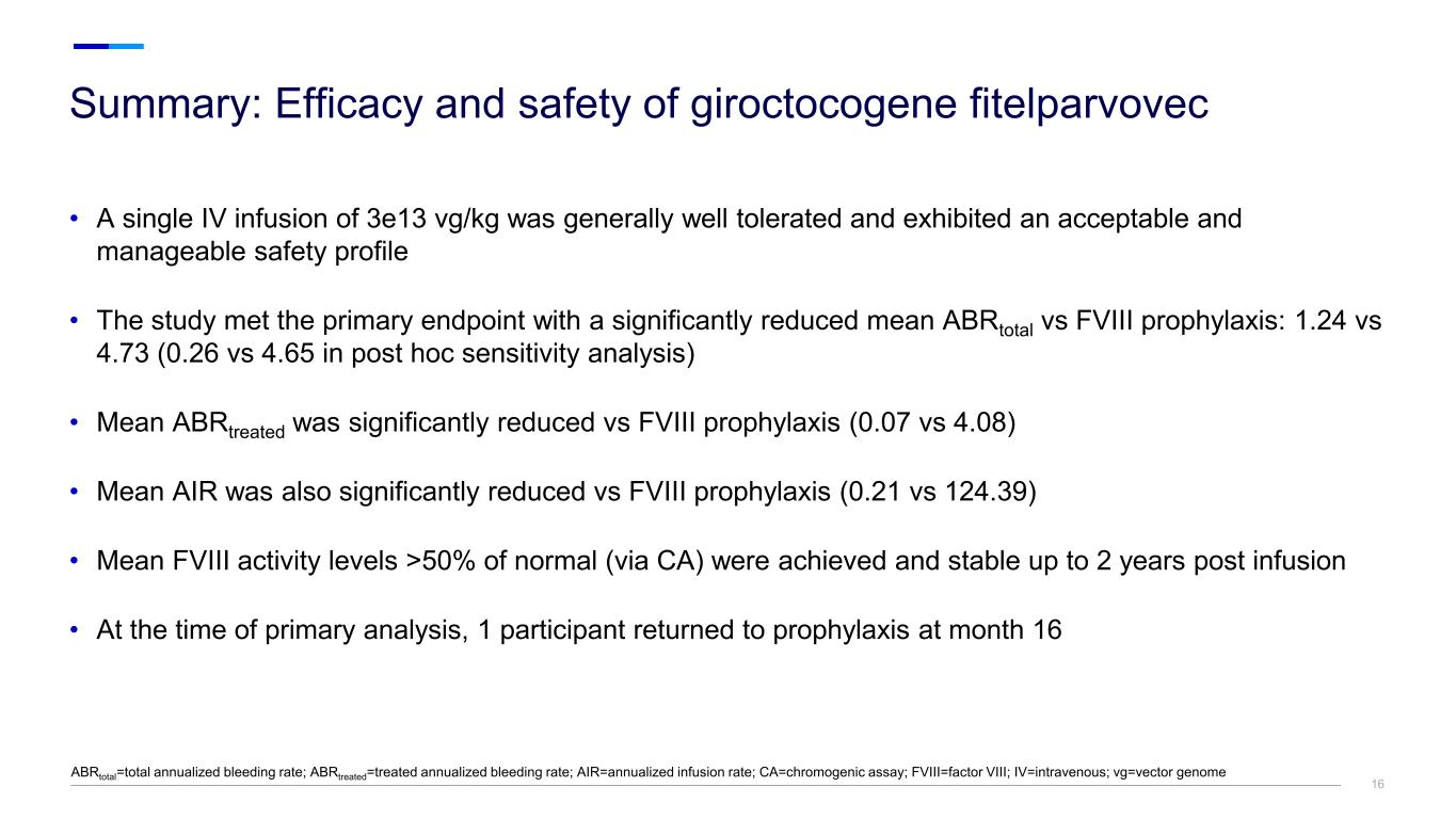 16 • A single IV infusion of 3e13 vg/kg was generally well tolerated and exhibited an acceptable and manageable safety profile • The study met the primary endpoint with a significantly reduced mean ABRtotal vs FVIII prophylaxis: 1.24 vs 4.73 (0.26 vs 4.65 in post hoc sensitivity analysis) • Mean ABRtreated was significantly reduced vs FVIII prophylaxis (0.07 vs 4.08) • Mean AIR was also significantly reduced vs FVIII prophylaxis (0.21 vs 124.39) • Mean FVIII activity levels >50% of normal (via CA) were achieved and stable up to 2 years post infusion • At the time of primary analysis, 1 participant returned to prophylaxis at month 16 Summary: Efficacy and safety of giroctocogene fitelparvovec ABRtotal=total annualized bleeding rate; ABRtreated=treated annualized bleeding rate; AIR=annualized infusion rate; CA=chromogenic assay; FVIII=factor VIII; IV=intravenous; vg=vector genome