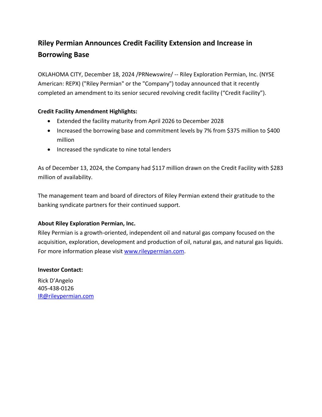 Riley Permian Announces Credit Facility Extension and Increase in Borrowing Base OKLAHOMA CITY, December 18, 2024 /PRNewswire/ -- Riley Exploration Permian, Inc. (NYSE American: REPX) ("Riley Permian" or the "Company") today announced that it recently completed an amendment to its senior secured revolving credit facility (“Credit Facility”). Credit Facility Amendment Highlights: • Extended the facility maturity from April 2026 to December 2028 • Increased the borrowing base and commitment levels by 7% from $375 million to $400 million • Increased the syndicate to nine total lenders As of December 13, 2024, the Company had $117 million drawn on the Credit Facility with $283 million of availability. The management team and board of directors of Riley Permian extend their gratitude to the banking syndicate partners for their continued support. About Riley Exploration Permian, Inc. Riley Permian is a growth-oriented, independent oil and natural gas company focused on the acquisition, exploration, development and production of oil, natural gas, and natural gas liquids. For more information please visit www.rileypermian.com. Investor Contact: Rick D’Angelo 405-438-0126 IR@rileypermian.com
