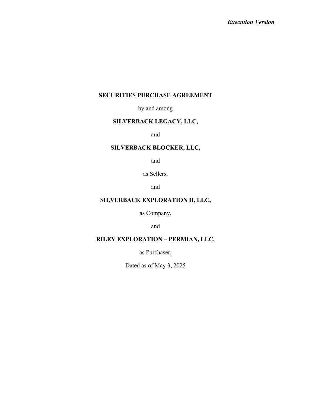 Execution Version SECURITIES PURCHASE AGREEMENT by and among SILVERBACK LEGACY, LLC, and SILVERBACK BLOCKER, LLC, and as Sellers, and SILVERBACK EXPLORATION II, LLC, as Company, and RILEY EXPLORATION – PERMIAN, LLC, as Purchaser, Dated as of May 3, 2025
