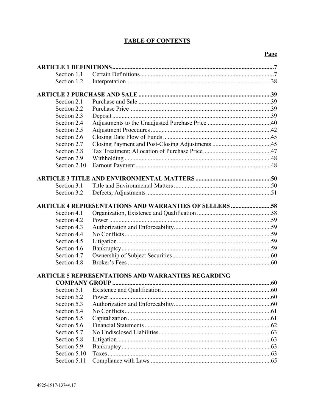 4925-1917-1374v.17 TABLE OF CONTENTS Page ARTICLE 1 DEFINITIONS .........................................................................................................7 Section 1.1 Certain Definitions .......................................................................................7 Section 1.2 Interpretation ..............................................................................................38 ARTICLE 2 PURCHASE AND SALE ......................................................................................39 Section 2.1 Purchase and Sale ......................................................................................39 Section 2.2 Purchase Price ............................................................................................39 Section 2.3 Deposit .......................................................................................................39 Section 2.4 Adjustments to the Unadjusted Purchase Price .........................................40 Section 2.5 Adjustment Procedures ..............................................................................42 Section 2.6 Closing Date Flow of Funds ......................................................................45 Section 2.7 Closing Payment and Post-Closing Adjustments ......................................45 Section 2.8 Tax Treatment; Allocation of Purchase Price ............................................47 Section 2.9 Withholding ...............................................................................................48 Section 2.10 Earnout Payment ........................................................................................48 ARTICLE 3 TITLE AND ENVIRONMENTAL MATTERS .................................................50 Section 3.1 Title and Environmental Matters ...............................................................50 Section 3.2 Defects; Adjustments .................................................................................51 ARTICLE 4 REPRESENTATIONS AND WARRANTIES OF SELLERS ..........................58 Section 4.1 Organization, Existence and Qualification ................................................58 Section 4.2 Power .........................................................................................................59 Section 4.3 Authorization and Enforceability ...............................................................59 Section 4.4 No Conflicts ...............................................................................................59 Section 4.5 Litigation ....................................................................................................59 Section 4.6 Bankruptcy .................................................................................................59 Section 4.7 Ownership of Subject Securities ................................................................60 Section 4.8 Broker’s Fees .............................................................................................60 ARTICLE 5 REPRESENTATIONS AND WARRANTIES REGARDING COMPANY GROUP .......................................................................................................60 Section 5.1 Existence and Qualification .......................................................................60 Section 5.2 Power .........................................................................................................60 Section 5.3 Authorization and Enforceability ...............................................................60 Section 5.4 No Conflicts ...............................................................................................61 Section 5.5 Capitalization .............................................................................................61 Section 5.6 Financial Statements ..................................................................................62 Section 5.7 No Undisclosed Liabilities .........................................................................63 Section 5.8 Litigation ....................................................................................................63 Section 5.9 Bankruptcy .................................................................................................63 Section 5.10 Taxes ..........................................................................................................63 Section 5.11 Compliance with Laws ..............................................................................65