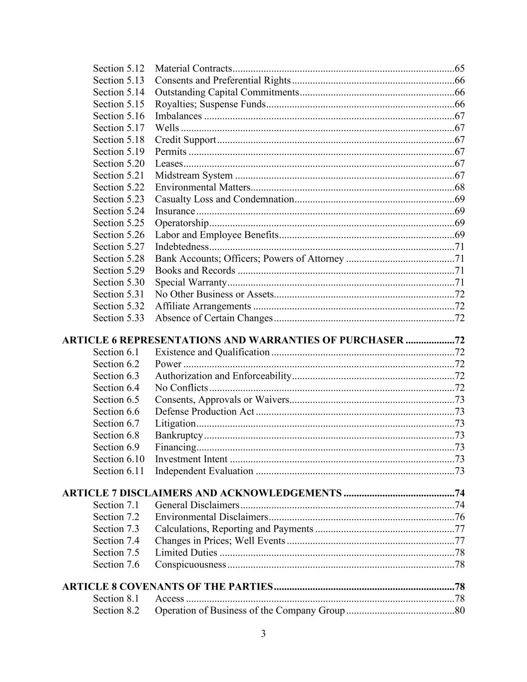 3 Section 5.12 Material Contracts ......................................................................................65 Section 5.13 Consents and Preferential Rights ...............................................................66 Section 5.14 Outstanding Capital Commitments ............................................................66 Section 5.15 Royalties; Suspense Funds .........................................................................66 Section 5.16 Imbalances .................................................................................................67 Section 5.17 Wells ..........................................................................................................67 Section 5.18 Credit Support ............................................................................................67 Section 5.19 Permits .......................................................................................................67 Section 5.20 Leases .........................................................................................................67 Section 5.21 Midstream System .....................................................................................67 Section 5.22 Environmental Matters...............................................................................68 Section 5.23 Casualty Loss and Condemnation ..............................................................69 Section 5.24 Insurance ....................................................................................................69 Section 5.25 Operatorship ...............................................................................................69 Section 5.26 Labor and Employee Benefits ....................................................................69 Section 5.27 Indebtedness ...............................................................................................71 Section 5.28 Bank Accounts; Officers; Powers of Attorney ..........................................71 Section 5.29 Books and Records ....................................................................................71 Section 5.30 Special Warranty ........................................................................................71 Section 5.31 No Other Business or Assets......................................................................72 Section 5.32 Affiliate Arrangements ..............................................................................72 Section 5.33 Absence of Certain Changes ......................................................................72 ARTICLE 6 REPRESENTATIONS AND WARRANTIES OF PURCHASER ...................72 Section 6.1 Existence and Qualification .......................................................................72 Section 6.2 Power .........................................................................................................72 Section 6.3 Authorization and Enforceability ...............................................................72 Section 6.4 No Conflicts ...............................................................................................72 Section 6.5 Consents, Approvals or Waivers................................................................73 Section 6.6 Defense Production Act .............................................................................73 Section 6.7 Litigation ....................................................................................................73 Section 6.8 Bankruptcy .................................................................................................73 Section 6.9 Financing....................................................................................................73 Section 6.10 Investment Intent .......................................................................................73 Section 6.11 Independent Evaluation .............................................................................73 ARTICLE 7 DISCLAIMERS AND ACKNOWLEDGEMENTS ...........................................74 Section 7.1 General Disclaimers ...................................................................................74 Section 7.2 Environmental Disclaimers ........................................................................76 Section 7.3 Calculations, Reporting and Payments ......................................................77 Section 7.4 Changes in Prices; Well Events .................................................................77 Section 7.5 Limited Duties ...........................................................................................78 Section 7.6 Conspicuousness ........................................................................................78 ARTICLE 8 COVENANTS OF THE PARTIES ......................................................................78 Section 8.1 Access ........................................................................................................78 Section 8.2 Operation of Business of the Company Group ..........................................80