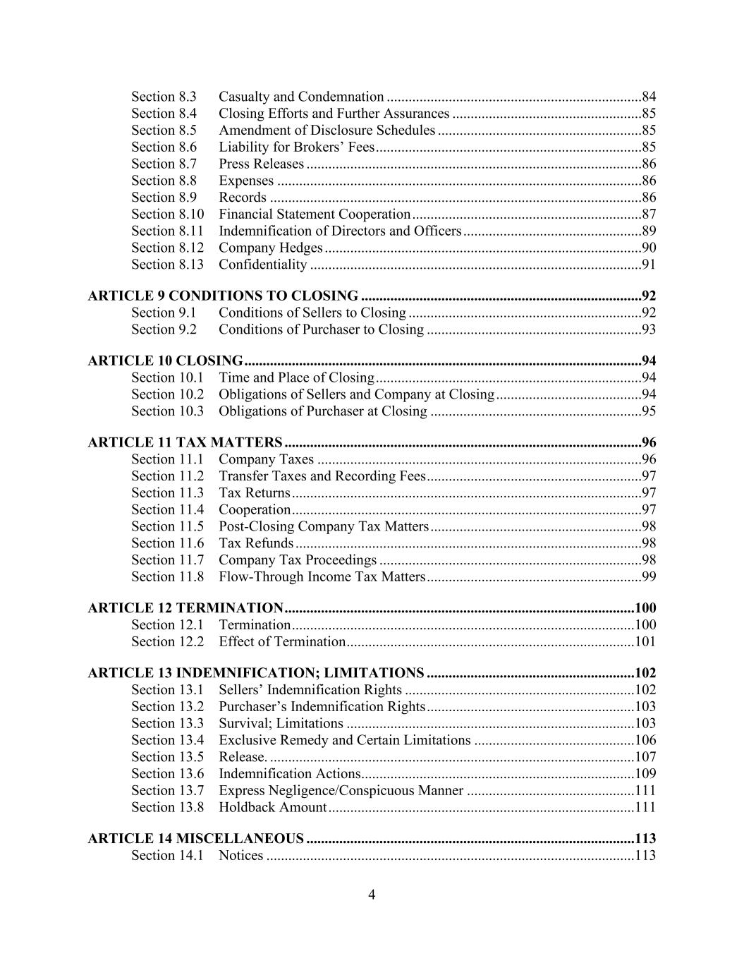 4 Section 8.3 Casualty and Condemnation ......................................................................84 Section 8.4 Closing Efforts and Further Assurances ....................................................85 Section 8.5 Amendment of Disclosure Schedules ........................................................85 Section 8.6 Liability for Brokers’ Fees .........................................................................85 Section 8.7 Press Releases ............................................................................................86 Section 8.8 Expenses ....................................................................................................86 Section 8.9 Records ......................................................................................................86 Section 8.10 Financial Statement Cooperation ...............................................................87 Section 8.11 Indemnification of Directors and Officers .................................................89 Section 8.12 Company Hedges .......................................................................................90 Section 8.13 Confidentiality ...........................................................................................91 ARTICLE 9 CONDITIONS TO CLOSING .............................................................................92 Section 9.1 Conditions of Sellers to Closing ................................................................92 Section 9.2 Conditions of Purchaser to Closing ...........................................................93 ARTICLE 10 CLOSING .............................................................................................................94 Section 10.1 Time and Place of Closing .........................................................................94 Section 10.2 Obligations of Sellers and Company at Closing ........................................94 Section 10.3 Obligations of Purchaser at Closing ..........................................................95 ARTICLE 11 TAX MATTERS ..................................................................................................96 Section 11.1 Company Taxes .........................................................................................96 Section 11.2 Transfer Taxes and Recording Fees ...........................................................97 Section 11.3 Tax Returns ................................................................................................97 Section 11.4 Cooperation ................................................................................................97 Section 11.5 Post-Closing Company Tax Matters ..........................................................98 Section 11.6 Tax Refunds ...............................................................................................98 Section 11.7 Company Tax Proceedings ........................................................................98 Section 11.8 Flow-Through Income Tax Matters ...........................................................99 ARTICLE 12 TERMINATION ................................................................................................100 Section 12.1 Termination ..............................................................................................100 Section 12.2 Effect of Termination ...............................................................................101 ARTICLE 13 INDEMNIFICATION; LIMITATIONS .........................................................102 Section 13.1 Sellers’ Indemnification Rights ...............................................................102 Section 13.2 Purchaser’s Indemnification Rights .........................................................103 Section 13.3 Survival; Limitations ...............................................................................103 Section 13.4 Exclusive Remedy and Certain Limitations ............................................106 Section 13.5 Release. ....................................................................................................107 Section 13.6 Indemnification Actions...........................................................................109 Section 13.7 Express Negligence/Conspicuous Manner ..............................................111 Section 13.8 Holdback Amount ....................................................................................111 ARTICLE 14 MISCELLANEOUS ..........................................................................................113 Section 14.1 Notices .....................................................................................................113