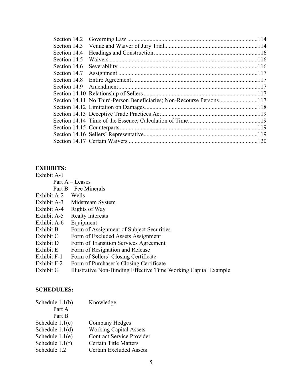 5 Section 14.2 Governing Law ........................................................................................114 Section 14.3 Venue and Waiver of Jury Trial ...............................................................114 Section 14.4 Headings and Construction ......................................................................116 Section 14.5 Waivers ....................................................................................................116 Section 14.6 Severability ..............................................................................................116 Section 14.7 Assignment ..............................................................................................117 Section 14.8 Entire Agreement .....................................................................................117 Section 14.9 Amendment ..............................................................................................117 Section 14.10 Relationship of Sellers .............................................................................117 Section 14.11 No Third-Person Beneficiaries; Non-Recourse Persons ..........................117 Section 14.12 Limitation on Damages ............................................................................118 Section 14.13 Deceptive Trade Practices Act .................................................................119 Section 14.14 Time of the Essence; Calculation of Time ...............................................119 Section 14.15 Counterparts .............................................................................................119 Section 14.16 Sellers’ Representative.............................................................................119 Section 14.17 Certain Waivers .......................................................................................120 EXHIBITS: Exhibit A-1 Part A – Leases Part B – Fee Minerals Exhibit A-2 Wells Exhibit A-3 Midstream System Exhibit A-4 Rights of Way Exhibit A-5 Realty Interests Exhibit A-6 Equipment Exhibit B Form of Assignment of Subject Securities Exhibit C Form of Excluded Assets Assignment Exhibit D Form of Transition Services Agreement Exhibit E Form of Resignation and Release Exhibit F-1 Form of Sellers’ Closing Certificate Exhibit F-2 Form of Purchaser’s Closing Certificate Exhibit G Illustrative Non-Binding Effective Time Working Capital Example SCHEDULES: Schedule 1.1(b) Knowledge Part A Part B Schedule 1.1(c) Company Hedges Schedule 1.1(d) Working Capital Assets Schedule 1.1(e) Contract Service Provider Schedule 1.1(f) Certain Title Matters Schedule 1.2 Certain Excluded Assets
