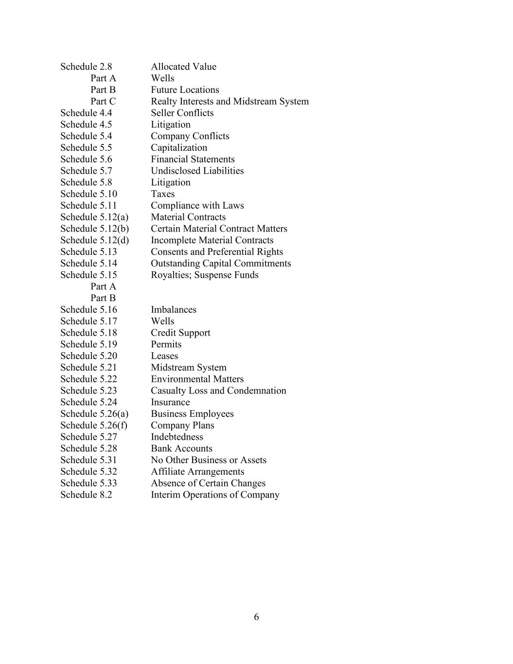 6 Schedule 2.8 Allocated Value Part A Wells Part B Future Locations Part C Realty Interests and Midstream System Schedule 4.4 Seller Conflicts Schedule 4.5 Litigation Schedule 5.4 Company Conflicts Schedule 5.5 Capitalization Schedule 5.6 Financial Statements Schedule 5.7 Undisclosed Liabilities Schedule 5.8 Litigation Schedule 5.10 Taxes Schedule 5.11 Compliance with Laws Schedule 5.12(a) Material Contracts Schedule 5.12(b) Certain Material Contract Matters Schedule 5.12(d) Incomplete Material Contracts Schedule 5.13 Consents and Preferential Rights Schedule 5.14 Outstanding Capital Commitments Schedule 5.15 Royalties; Suspense Funds Part A Part B Schedule 5.16 Imbalances Schedule 5.17 Wells Schedule 5.18 Credit Support Schedule 5.19 Permits Schedule 5.20 Leases Schedule 5.21 Midstream System Schedule 5.22 Environmental Matters Schedule 5.23 Casualty Loss and Condemnation Schedule 5.24 Insurance Schedule 5.26(a) Business Employees Schedule 5.26(f) Company Plans Schedule 5.27 Indebtedness Schedule 5.28 Bank Accounts Schedule 5.31 No Other Business or Assets Schedule 5.32 Affiliate Arrangements Schedule 5.33 Absence of Certain Changes Schedule 8.2 Interim Operations of Company