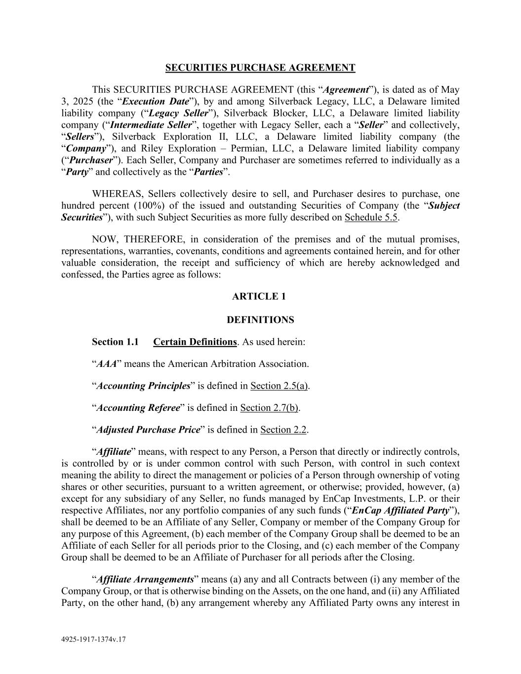 4925-1917-1374v.17 SECURITIES PURCHASE AGREEMENT This SECURITIES PURCHASE AGREEMENT (this “Agreement”), is dated as of May 3, 2025 (the “Execution Date”), by and among Silverback Legacy, LLC, a Delaware limited liability company (“Legacy Seller”), Silverback Blocker, LLC, a Delaware limited liability company (“Intermediate Seller”, together with Legacy Seller, each a “Seller” and collectively, “Sellers”), Silverback Exploration II, LLC, a Delaware limited liability company (the “Company”), and Riley Exploration – Permian, LLC, a Delaware limited liability company (“Purchaser”). Each Seller, Company and Purchaser are sometimes referred to individually as a “Party” and collectively as the “Parties”. WHEREAS, Sellers collectively desire to sell, and Purchaser desires to purchase, one hundred percent (100%) of the issued and outstanding Securities of Company (the “Subject Securities”), with such Subject Securities as more fully described on Schedule 5.5. NOW, THEREFORE, in consideration of the premises and of the mutual promises, representations, warranties, covenants, conditions and agreements contained herein, and for other valuable consideration, the receipt and sufficiency of which are hereby acknowledged and confessed, the Parties agree as follows: ARTICLE 1 DEFINITIONS Section 1.1 Certain Definitions. As used herein: “AAA” means the American Arbitration Association. “Accounting Principles” is defined in Section 2.5(a). “Accounting Referee” is defined in Section 2.7(b). “Adjusted Purchase Price” is defined in Section 2.2. “Affiliate” means, with respect to any Person, a Person that directly or indirectly controls, is controlled by or is under common control with such Person, with control in such context meaning the ability to direct the management or policies of a Person through ownership of voting shares or other securities, pursuant to a written agreement, or otherwise; provided, however, (a) except for any subsidiary of any Seller, no funds managed by EnCap Investments, L.P. or their respective Affiliates, nor any portfolio companies of any such funds (“EnCap Affiliated Party”), shall be deemed to be an Affiliate of any Seller, Company or member of the Company Group for any purpose of this Agreement, (b) each member of the Company Group shall be deemed to be an Affiliate of each Seller for all periods prior to the Closing, and (c) each member of the Company Group shall be deemed to be an Affiliate of Purchaser for all periods after the Closing. “Affiliate Arrangements” means (a) any and all Contracts between (i) any member of the Company Group, or that is otherwise binding on the Assets, on the one hand, and (ii) any Affiliated Party, on the other hand, (b) any arrangement whereby any Affiliated Party owns any interest in