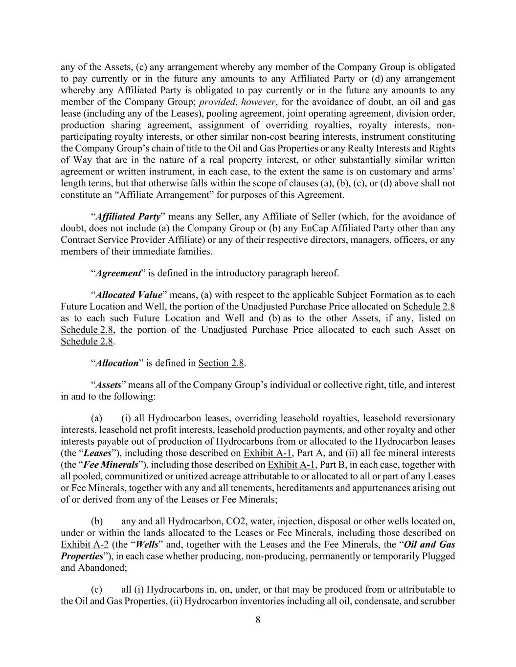 8 any of the Assets, (c) any arrangement whereby any member of the Company Group is obligated to pay currently or in the future any amounts to any Affiliated Party or (d) any arrangement whereby any Affiliated Party is obligated to pay currently or in the future any amounts to any member of the Company Group; provided, however, for the avoidance of doubt, an oil and gas lease (including any of the Leases), pooling agreement, joint operating agreement, division order, production sharing agreement, assignment of overriding royalties, royalty interests, non- participating royalty interests, or other similar non-cost bearing interests, instrument constituting the Company Group’s chain of title to the Oil and Gas Properties or any Realty Interests and Rights of Way that are in the nature of a real property interest, or other substantially similar written agreement or written instrument, in each case, to the extent the same is on customary and arms’ length terms, but that otherwise falls within the scope of clauses (a), (b), (c), or (d) above shall not constitute an “Affiliate Arrangement” for purposes of this Agreement. “Affiliated Party” means any Seller, any Affiliate of Seller (which, for the avoidance of doubt, does not include (a) the Company Group or (b) any EnCap Affiliated Party other than any Contract Service Provider Affiliate) or any of their respective directors, managers, officers, or any members of their immediate families. “Agreement” is defined in the introductory paragraph hereof. “Allocated Value” means, (a) with respect to the applicable Subject Formation as to each Future Location and Well, the portion of the Unadjusted Purchase Price allocated on Schedule 2.8 as to each such Future Location and Well and (b) as to the other Assets, if any, listed on Schedule 2.8, the portion of the Unadjusted Purchase Price allocated to each such Asset on Schedule 2.8. “Allocation” is defined in Section 2.8. “Assets” means all of the Company Group’s individual or collective right, title, and interest in and to the following: (a) (i) all Hydrocarbon leases, overriding leasehold royalties, leasehold reversionary interests, leasehold net profit interests, leasehold production payments, and other royalty and other interests payable out of production of Hydrocarbons from or allocated to the Hydrocarbon leases (the “Leases”), including those described on Exhibit A-1, Part A, and (ii) all fee mineral interests (the “Fee Minerals”), including those described on Exhibit A-1, Part B, in each case, together with all pooled, communitized or unitized acreage attributable to or allocated to all or part of any Leases or Fee Minerals, together with any and all tenements, hereditaments and appurtenances arising out of or derived from any of the Leases or Fee Minerals; (b) any and all Hydrocarbon, CO2, water, injection, disposal or other wells located on, under or within the lands allocated to the Leases or Fee Minerals, including those described on Exhibit A-2 (the “Wells” and, together with the Leases and the Fee Minerals, the “Oil and Gas Properties”), in each case whether producing, non-producing, permanently or temporarily Plugged and Abandoned; (c) all (i) Hydrocarbons in, on, under, or that may be produced from or attributable to the Oil and Gas Properties, (ii) Hydrocarbon inventories including all oil, condensate, and scrubber