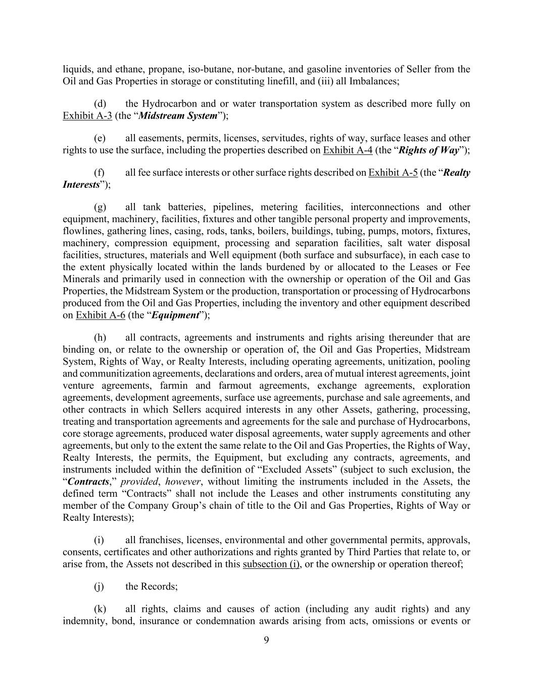 9 liquids, and ethane, propane, iso-butane, nor-butane, and gasoline inventories of Seller from the Oil and Gas Properties in storage or constituting linefill, and (iii) all Imbalances; (d) the Hydrocarbon and or water transportation system as described more fully on Exhibit A-3 (the “Midstream System”); (e) all easements, permits, licenses, servitudes, rights of way, surface leases and other rights to use the surface, including the properties described on Exhibit A-4 (the “Rights of Way”); (f) all fee surface interests or other surface rights described on Exhibit A-5 (the “Realty Interests”); (g) all tank batteries, pipelines, metering facilities, interconnections and other equipment, machinery, facilities, fixtures and other tangible personal property and improvements, flowlines, gathering lines, casing, rods, tanks, boilers, buildings, tubing, pumps, motors, fixtures, machinery, compression equipment, processing and separation facilities, salt water disposal facilities, structures, materials and Well equipment (both surface and subsurface), in each case to the extent physically located within the lands burdened by or allocated to the Leases or Fee Minerals and primarily used in connection with the ownership or operation of the Oil and Gas Properties, the Midstream System or the production, transportation or processing of Hydrocarbons produced from the Oil and Gas Properties, including the inventory and other equipment described on Exhibit A-6 (the “Equipment”); (h) all contracts, agreements and instruments and rights arising thereunder that are binding on, or relate to the ownership or operation of, the Oil and Gas Properties, Midstream System, Rights of Way, or Realty Interests, including operating agreements, unitization, pooling and communitization agreements, declarations and orders, area of mutual interest agreements, joint venture agreements, farmin and farmout agreements, exchange agreements, exploration agreements, development agreements, surface use agreements, purchase and sale agreements, and other contracts in which Sellers acquired interests in any other Assets, gathering, processing, treating and transportation agreements and agreements for the sale and purchase of Hydrocarbons, core storage agreements, produced water disposal agreements, water supply agreements and other agreements, but only to the extent the same relate to the Oil and Gas Properties, the Rights of Way, Realty Interests, the permits, the Equipment, but excluding any contracts, agreements, and instruments included within the definition of “Excluded Assets” (subject to such exclusion, the “Contracts,” provided, however, without limiting the instruments included in the Assets, the defined term “Contracts” shall not include the Leases and other instruments constituting any member of the Company Group’s chain of title to the Oil and Gas Properties, Rights of Way or Realty Interests); (i) all franchises, licenses, environmental and other governmental permits, approvals, consents, certificates and other authorizations and rights granted by Third Parties that relate to, or arise from, the Assets not described in this subsection (i), or the ownership or operation thereof; (j) the Records; (k) all rights, claims and causes of action (including any audit rights) and any indemnity, bond, insurance or condemnation awards arising from acts, omissions or events or