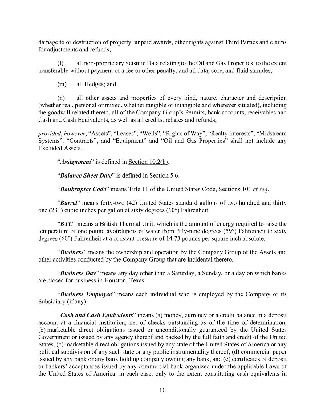 10 damage to or destruction of property, unpaid awards, other rights against Third Parties and claims for adjustments and refunds; (l) all non-proprietary Seismic Data relating to the Oil and Gas Properties, to the extent transferable without payment of a fee or other penalty, and all data, core, and fluid samples; (m) all Hedges; and (n) all other assets and properties of every kind, nature, character and description (whether real, personal or mixed, whether tangible or intangible and wherever situated), including the goodwill related thereto, all of the Company Group’s Permits, bank accounts, receivables and Cash and Cash Equivalents, as well as all credits, rebates and refunds; provided, however, “Assets”, “Leases”, “Wells”, “Rights of Way”, “Realty Interests”, “Midstream Systems”, “Contracts”, and “Equipment” and “Oil and Gas Properties” shall not include any Excluded Assets. “Assignment” is defined in Section 10.2(b). “Balance Sheet Date” is defined in Section 5.6. “Bankruptcy Code” means Title 11 of the United States Code, Sections 101 et seq. “Barrel” means forty-two (42) United States standard gallons of two hundred and thirty one (231) cubic inches per gallon at sixty degrees (60°) Fahrenheit. “BTU” means a British Thermal Unit, which is the amount of energy required to raise the temperature of one pound avoirdupois of water from fifty-nine degrees (59°) Fahrenheit to sixty degrees (60°) Fahrenheit at a constant pressure of 14.73 pounds per square inch absolute. “Business” means the ownership and operation by the Company Group of the Assets and other activities conducted by the Company Group that are incidental thereto. “Business Day” means any day other than a Saturday, a Sunday, or a day on which banks are closed for business in Houston, Texas. “Business Employee” means each individual who is employed by the Company or its Subsidiary (if any). “Cash and Cash Equivalents” means (a) money, currency or a credit balance in a deposit account at a financial institution, net of checks outstanding as of the time of determination, (b) marketable direct obligations issued or unconditionally guaranteed by the United States Government or issued by any agency thereof and backed by the full faith and credit of the United States, (c) marketable direct obligations issued by any state of the United States of America or any political subdivision of any such state or any public instrumentality thereof, (d) commercial paper issued by any bank or any bank holding company owning any bank, and (e) certificates of deposit or bankers’ acceptances issued by any commercial bank organized under the applicable Laws of the United States of America, in each case, only to the extent constituting cash equivalents in