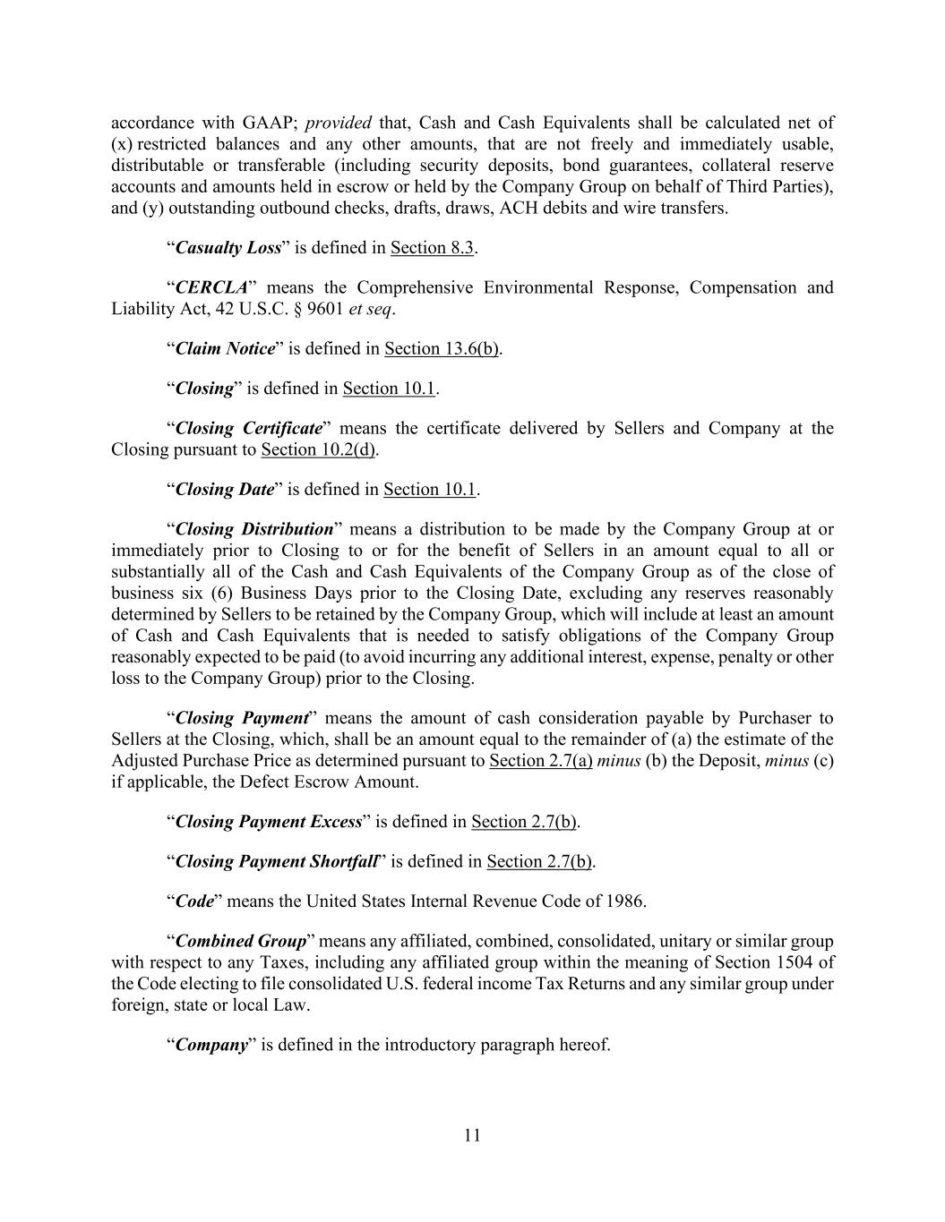 11 accordance with GAAP; provided that, Cash and Cash Equivalents shall be calculated net of (x) restricted balances and any other amounts, that are not freely and immediately usable, distributable or transferable (including security deposits, bond guarantees, collateral reserve accounts and amounts held in escrow or held by the Company Group on behalf of Third Parties), and (y) outstanding outbound checks, drafts, draws, ACH debits and wire transfers. “Casualty Loss” is defined in Section 8.3. “CERCLA” means the Comprehensive Environmental Response, Compensation and Liability Act, 42 U.S.C. § 9601 et seq. “Claim Notice” is defined in Section 13.6(b). “Closing” is defined in Section 10.1. “Closing Certificate” means the certificate delivered by Sellers and Company at the Closing pursuant to Section 10.2(d). “Closing Date” is defined in Section 10.1. “Closing Distribution” means a distribution to be made by the Company Group at or immediately prior to Closing to or for the benefit of Sellers in an amount equal to all or substantially all of the Cash and Cash Equivalents of the Company Group as of the close of business six (6) Business Days prior to the Closing Date, excluding any reserves reasonably determined by Sellers to be retained by the Company Group, which will include at least an amount of Cash and Cash Equivalents that is needed to satisfy obligations of the Company Group reasonably expected to be paid (to avoid incurring any additional interest, expense, penalty or other loss to the Company Group) prior to the Closing. “Closing Payment” means the amount of cash consideration payable by Purchaser to Sellers at the Closing, which, shall be an amount equal to the remainder of (a) the estimate of the Adjusted Purchase Price as determined pursuant to Section 2.7(a) minus (b) the Deposit, minus (c) if applicable, the Defect Escrow Amount. “Closing Payment Excess” is defined in Section 2.7(b). “Closing Payment Shortfall” is defined in Section 2.7(b). “Code” means the United States Internal Revenue Code of 1986. “Combined Group” means any affiliated, combined, consolidated, unitary or similar group with respect to any Taxes, including any affiliated group within the meaning of Section 1504 of the Code electing to file consolidated U.S. federal income Tax Returns and any similar group under foreign, state or local Law. “Company” is defined in the introductory paragraph hereof.