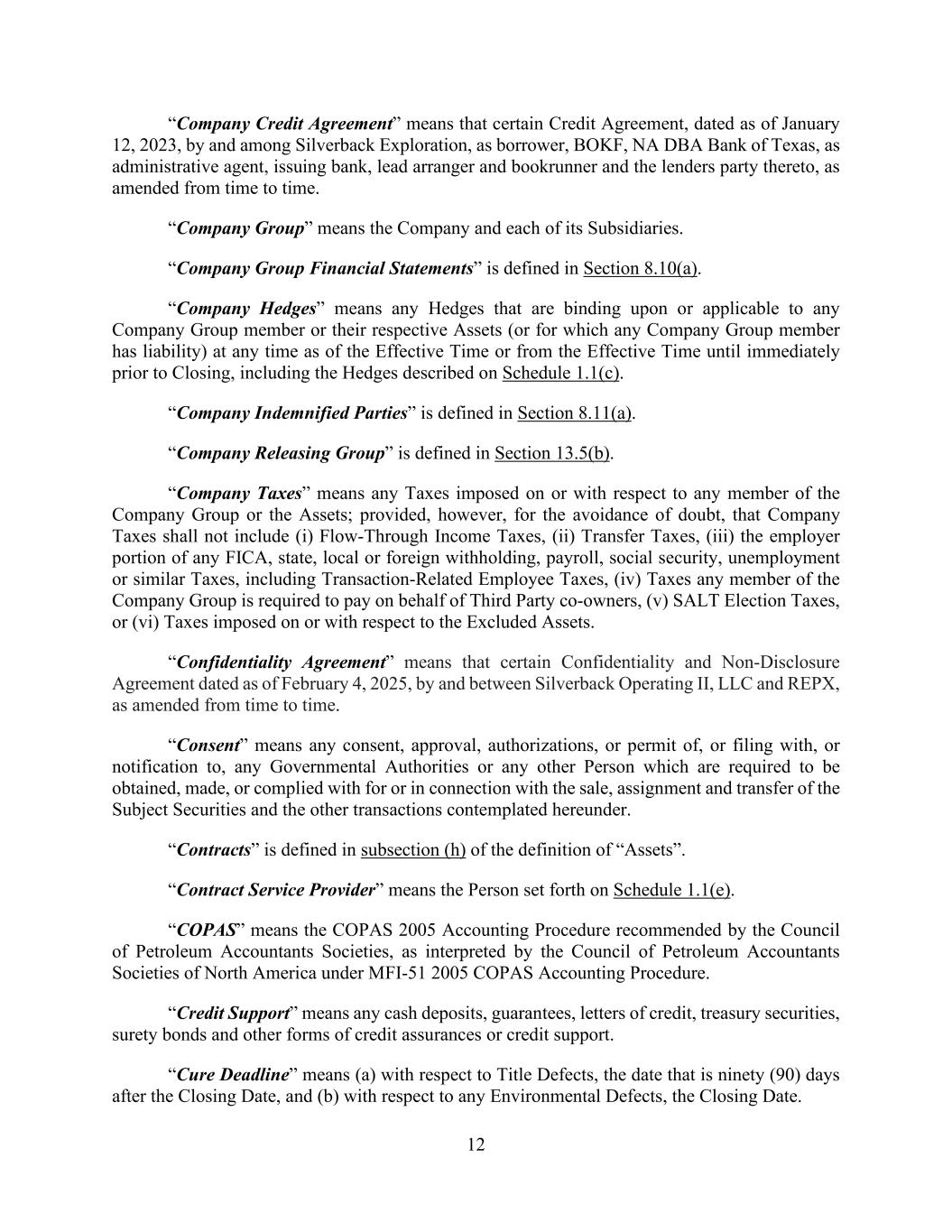 12 “Company Credit Agreement” means that certain Credit Agreement, dated as of January 12, 2023, by and among Silverback Exploration, as borrower, BOKF, NA DBA Bank of Texas, as administrative agent, issuing bank, lead arranger and bookrunner and the lenders party thereto, as amended from time to time. “Company Group” means the Company and each of its Subsidiaries. “Company Group Financial Statements” is defined in Section 8.10(a). “Company Hedges” means any Hedges that are binding upon or applicable to any Company Group member or their respective Assets (or for which any Company Group member has liability) at any time as of the Effective Time or from the Effective Time until immediately prior to Closing, including the Hedges described on Schedule 1.1(c). “Company Indemnified Parties” is defined in Section 8.11(a). “Company Releasing Group” is defined in Section 13.5(b). “Company Taxes” means any Taxes imposed on or with respect to any member of the Company Group or the Assets; provided, however, for the avoidance of doubt, that Company Taxes shall not include (i) Flow-Through Income Taxes, (ii) Transfer Taxes, (iii) the employer portion of any FICA, state, local or foreign withholding, payroll, social security, unemployment or similar Taxes, including Transaction-Related Employee Taxes, (iv) Taxes any member of the Company Group is required to pay on behalf of Third Party co-owners, (v) SALT Election Taxes, or (vi) Taxes imposed on or with respect to the Excluded Assets. “Confidentiality Agreement” means that certain Confidentiality and Non-Disclosure Agreement dated as of February 4, 2025, by and between Silverback Operating II, LLC and REPX, as amended from time to time. “Consent” means any consent, approval, authorizations, or permit of, or filing with, or notification to, any Governmental Authorities or any other Person which are required to be obtained, made, or complied with for or in connection with the sale, assignment and transfer of the Subject Securities and the other transactions contemplated hereunder. “Contracts” is defined in subsection (h) of the definition of “Assets”. “Contract Service Provider” means the Person set forth on Schedule 1.1(e). “COPAS” means the COPAS 2005 Accounting Procedure recommended by the Council of Petroleum Accountants Societies, as interpreted by the Council of Petroleum Accountants Societies of North America under MFI-51 2005 COPAS Accounting Procedure. “Credit Support” means any cash deposits, guarantees, letters of credit, treasury securities, surety bonds and other forms of credit assurances or credit support. “Cure Deadline” means (a) with respect to Title Defects, the date that is ninety (90) days after the Closing Date, and (b) with respect to any Environmental Defects, the Closing Date.