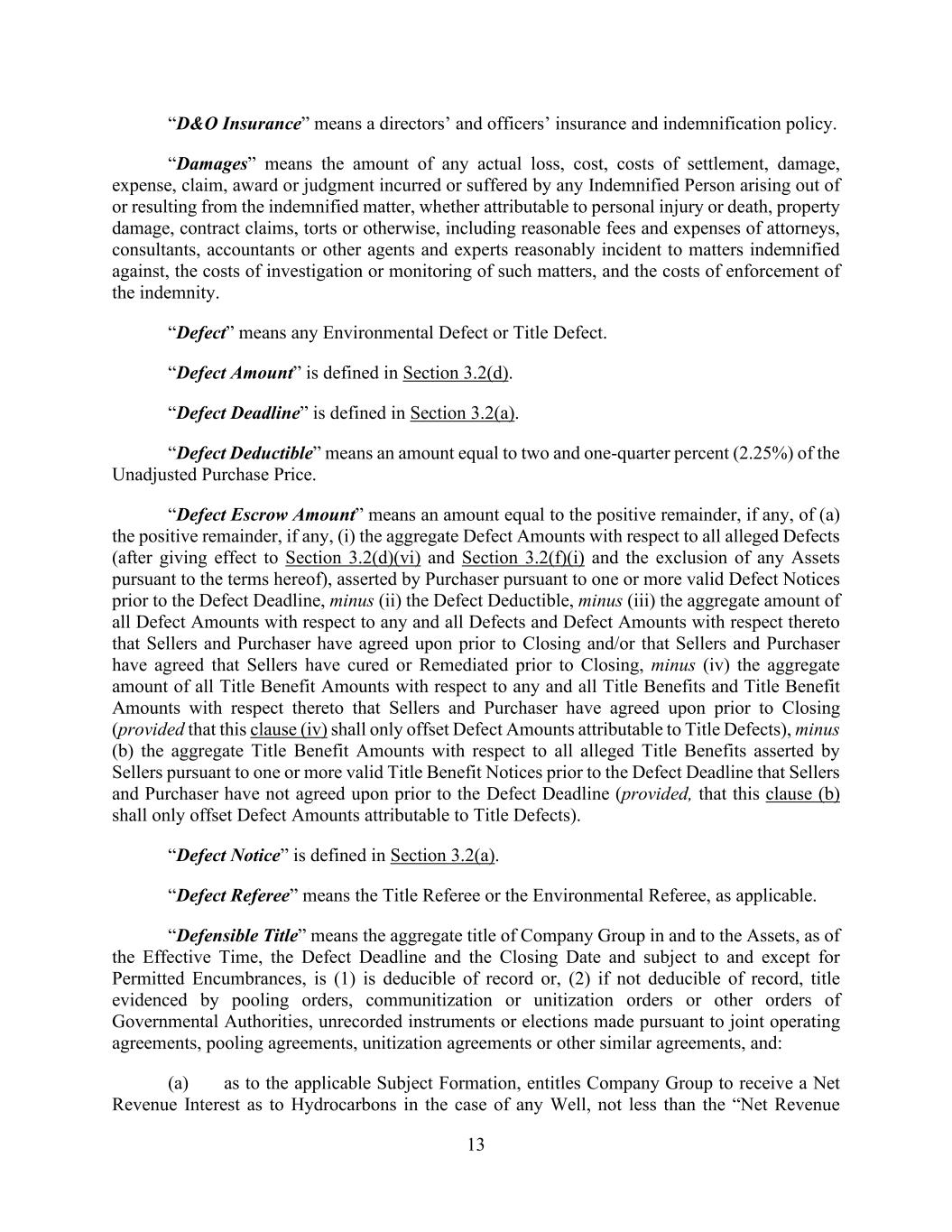 13 “D&O Insurance” means a directors’ and officers’ insurance and indemnification policy. “Damages” means the amount of any actual loss, cost, costs of settlement, damage, expense, claim, award or judgment incurred or suffered by any Indemnified Person arising out of or resulting from the indemnified matter, whether attributable to personal injury or death, property damage, contract claims, torts or otherwise, including reasonable fees and expenses of attorneys, consultants, accountants or other agents and experts reasonably incident to matters indemnified against, the costs of investigation or monitoring of such matters, and the costs of enforcement of the indemnity. “Defect” means any Environmental Defect or Title Defect. “Defect Amount” is defined in Section 3.2(d). “Defect Deadline” is defined in Section 3.2(a). “Defect Deductible” means an amount equal to two and one-quarter percent (2.25%) of the Unadjusted Purchase Price. “Defect Escrow Amount” means an amount equal to the positive remainder, if any, of (a) the positive remainder, if any, (i) the aggregate Defect Amounts with respect to all alleged Defects (after giving effect to Section 3.2(d)(vi) and Section 3.2(f)(i) and the exclusion of any Assets pursuant to the terms hereof), asserted by Purchaser pursuant to one or more valid Defect Notices prior to the Defect Deadline, minus (ii) the Defect Deductible, minus (iii) the aggregate amount of all Defect Amounts with respect to any and all Defects and Defect Amounts with respect thereto that Sellers and Purchaser have agreed upon prior to Closing and/or that Sellers and Purchaser have agreed that Sellers have cured or Remediated prior to Closing, minus (iv) the aggregate amount of all Title Benefit Amounts with respect to any and all Title Benefits and Title Benefit Amounts with respect thereto that Sellers and Purchaser have agreed upon prior to Closing (provided that this clause (iv) shall only offset Defect Amounts attributable to Title Defects), minus (b) the aggregate Title Benefit Amounts with respect to all alleged Title Benefits asserted by Sellers pursuant to one or more valid Title Benefit Notices prior to the Defect Deadline that Sellers and Purchaser have not agreed upon prior to the Defect Deadline (provided, that this clause (b) shall only offset Defect Amounts attributable to Title Defects). “Defect Notice” is defined in Section 3.2(a). “Defect Referee” means the Title Referee or the Environmental Referee, as applicable. “Defensible Title” means the aggregate title of Company Group in and to the Assets, as of the Effective Time, the Defect Deadline and the Closing Date and subject to and except for Permitted Encumbrances, is (1) is deducible of record or, (2) if not deducible of record, title evidenced by pooling orders, communitization or unitization orders or other orders of Governmental Authorities, unrecorded instruments or elections made pursuant to joint operating agreements, pooling agreements, unitization agreements or other similar agreements, and: (a) as to the applicable Subject Formation, entitles Company Group to receive a Net Revenue Interest as to Hydrocarbons in the case of any Well, not less than the “Net Revenue