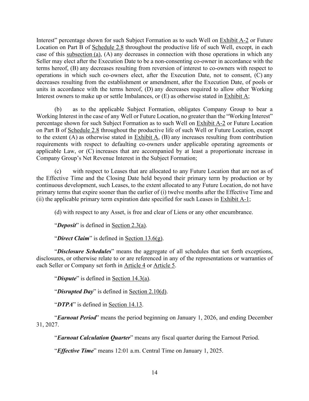 14 Interest” percentage shown for such Subject Formation as to such Well on Exhibit A-2 or Future Location on Part B of Schedule 2.8 throughout the productive life of such Well, except, in each case of this subsection (a), (A) any decreases in connection with those operations in which any Seller may elect after the Execution Date to be a non-consenting co-owner in accordance with the terms hereof, (B) any decreases resulting from reversion of interest to co-owners with respect to operations in which such co-owners elect, after the Execution Date, not to consent, (C) any decreases resulting from the establishment or amendment, after the Execution Date, of pools or units in accordance with the terms hereof, (D) any decreases required to allow other Working Interest owners to make up or settle Imbalances, or (E) as otherwise stated in Exhibit A; (b) as to the applicable Subject Formation, obligates Company Group to bear a Working Interest in the case of any Well or Future Location, no greater than the “Working Interest” percentage shown for such Subject Formation as to such Well on Exhibit A-2 or Future Location on Part B of Schedule 2.8 throughout the productive life of such Well or Future Location, except to the extent (A) as otherwise stated in Exhibit A, (B) any increases resulting from contribution requirements with respect to defaulting co-owners under applicable operating agreements or applicable Law, or (C) increases that are accompanied by at least a proportionate increase in Company Group’s Net Revenue Interest in the Subject Formation; (c) with respect to Leases that are allocated to any Future Location that are not as of the Effective Time and the Closing Date held beyond their primary term by production or by continuous development, such Leases, to the extent allocated to any Future Location, do not have primary terms that expire sooner than the earlier of (i) twelve months after the Effective Time and (ii) the applicable primary term expiration date specified for such Leases in Exhibit A-1; (d) with respect to any Asset, is free and clear of Liens or any other encumbrance. “Deposit” is defined in Section 2.3(a). “Direct Claim” is defined in Section 13.6(g). “Disclosure Schedules” means the aggregate of all schedules that set forth exceptions, disclosures, or otherwise relate to or are referenced in any of the representations or warranties of each Seller or Company set forth in Article 4 or Article 5. “Dispute” is defined in Section 14.3(a). “Disrupted Day” is defined in Section 2.10(d). “DTPA” is defined in Section 14.13. “Earnout Period” means the period beginning on January 1, 2026, and ending December 31, 2027. “Earnout Calculation Quarter” means any fiscal quarter during the Earnout Period. “Effective Time” means 12:01 a.m. Central Time on January 1, 2025.