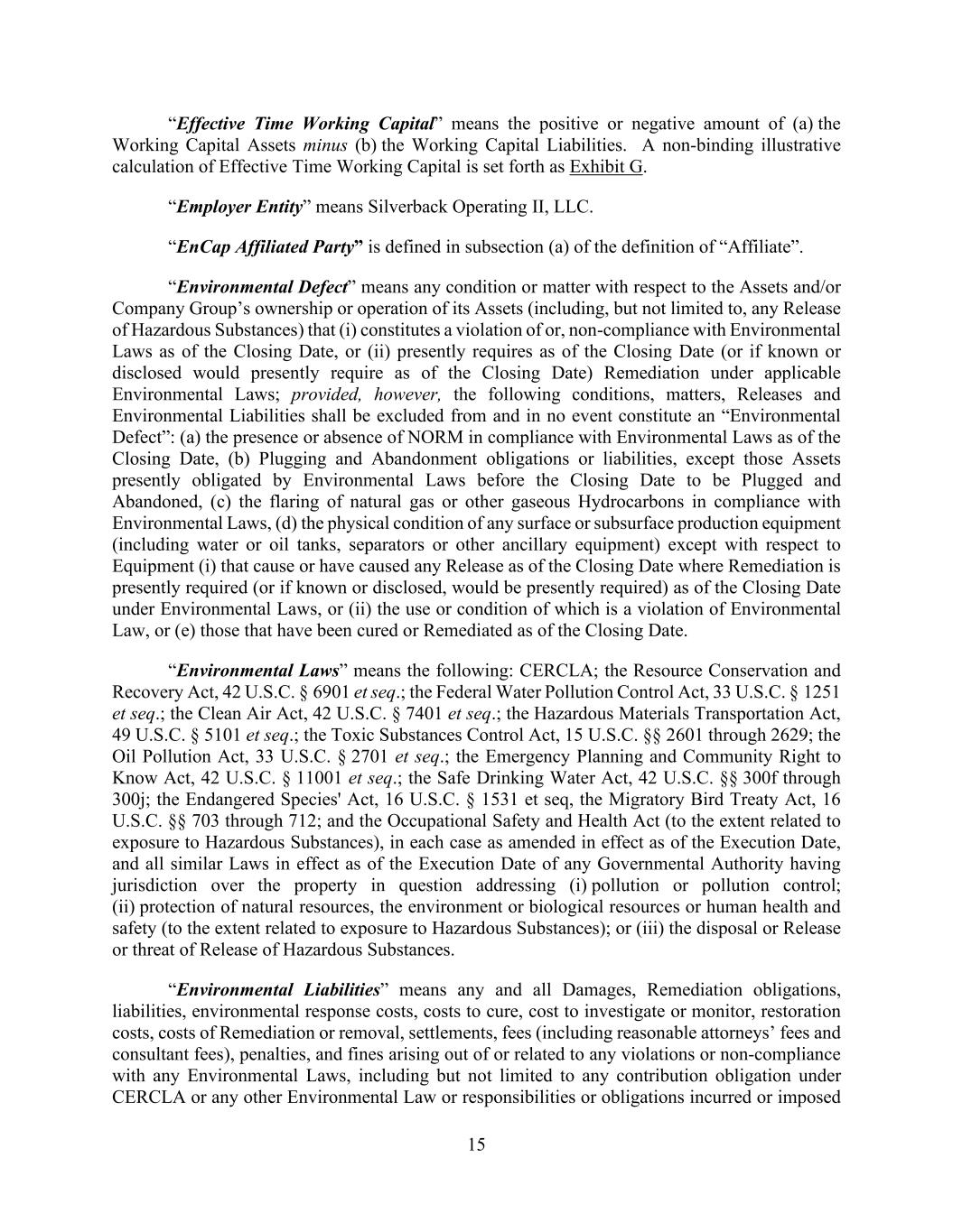 15 “Effective Time Working Capital” means the positive or negative amount of (a) the Working Capital Assets minus (b) the Working Capital Liabilities. A non-binding illustrative calculation of Effective Time Working Capital is set forth as Exhibit G. “Employer Entity” means Silverback Operating II, LLC. “EnCap Affiliated Party” is defined in subsection (a) of the definition of “Affiliate”. “Environmental Defect” means any condition or matter with respect to the Assets and/or Company Group’s ownership or operation of its Assets (including, but not limited to, any Release of Hazardous Substances) that (i) constitutes a violation of or, non-compliance with Environmental Laws as of the Closing Date, or (ii) presently requires as of the Closing Date (or if known or disclosed would presently require as of the Closing Date) Remediation under applicable Environmental Laws; provided, however, the following conditions, matters, Releases and Environmental Liabilities shall be excluded from and in no event constitute an “Environmental Defect”: (a) the presence or absence of NORM in compliance with Environmental Laws as of the Closing Date, (b) Plugging and Abandonment obligations or liabilities, except those Assets presently obligated by Environmental Laws before the Closing Date to be Plugged and Abandoned, (c) the flaring of natural gas or other gaseous Hydrocarbons in compliance with Environmental Laws, (d) the physical condition of any surface or subsurface production equipment (including water or oil tanks, separators or other ancillary equipment) except with respect to Equipment (i) that cause or have caused any Release as of the Closing Date where Remediation is presently required (or if known or disclosed, would be presently required) as of the Closing Date under Environmental Laws, or (ii) the use or condition of which is a violation of Environmental Law, or (e) those that have been cured or Remediated as of the Closing Date. “Environmental Laws” means the following: CERCLA; the Resource Conservation and Recovery Act, 42 U.S.C. § 6901 et seq.; the Federal Water Pollution Control Act, 33 U.S.C. § 1251 et seq.; the Clean Air Act, 42 U.S.C. § 7401 et seq.; the Hazardous Materials Transportation Act, 49 U.S.C. § 5101 et seq.; the Toxic Substances Control Act, 15 U.S.C. §§ 2601 through 2629; the Oil Pollution Act, 33 U.S.C. § 2701 et seq.; the Emergency Planning and Community Right to Know Act, 42 U.S.C. § 11001 et seq.; the Safe Drinking Water Act, 42 U.S.C. §§ 300f through 300j; the Endangered Species' Act, 16 U.S.C. § 1531 et seq, the Migratory Bird Treaty Act, 16 U.S.C. §§ 703 through 712; and the Occupational Safety and Health Act (to the extent related to exposure to Hazardous Substances), in each case as amended in effect as of the Execution Date, and all similar Laws in effect as of the Execution Date of any Governmental Authority having jurisdiction over the property in question addressing (i) pollution or pollution control; (ii) protection of natural resources, the environment or biological resources or human health and safety (to the extent related to exposure to Hazardous Substances); or (iii) the disposal or Release or threat of Release of Hazardous Substances. “Environmental Liabilities” means any and all Damages, Remediation obligations, liabilities, environmental response costs, costs to cure, cost to investigate or monitor, restoration costs, costs of Remediation or removal, settlements, fees (including reasonable attorneys’ fees and consultant fees), penalties, and fines arising out of or related to any violations or non-compliance with any Environmental Laws, including but not limited to any contribution obligation under CERCLA or any other Environmental Law or responsibilities or obligations incurred or imposed