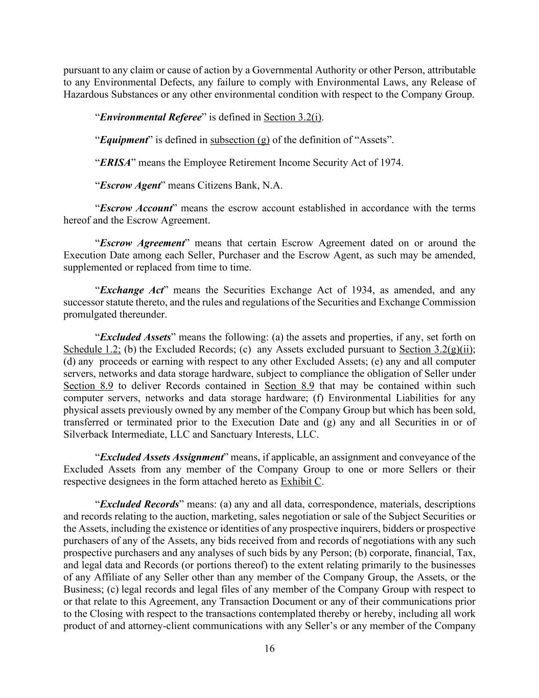 16 pursuant to any claim or cause of action by a Governmental Authority or other Person, attributable to any Environmental Defects, any failure to comply with Environmental Laws, any Release of Hazardous Substances or any other environmental condition with respect to the Company Group. “Environmental Referee” is defined in Section 3.2(i). “Equipment” is defined in subsection (g) of the definition of “Assets”. “ERISA” means the Employee Retirement Income Security Act of 1974. “Escrow Agent” means Citizens Bank, N.A. “Escrow Account” means the escrow account established in accordance with the terms hereof and the Escrow Agreement. “Escrow Agreement” means that certain Escrow Agreement dated on or around the Execution Date among each Seller, Purchaser and the Escrow Agent, as such may be amended, supplemented or replaced from time to time. “Exchange Act” means the Securities Exchange Act of 1934, as amended, and any successor statute thereto, and the rules and regulations of the Securities and Exchange Commission promulgated thereunder. “Excluded Assets” means the following: (a) the assets and properties, if any, set forth on Schedule 1.2; (b) the Excluded Records; (c) any Assets excluded pursuant to Section 3.2(g)(ii); (d) any proceeds or earning with respect to any other Excluded Assets; (e) any and all computer servers, networks and data storage hardware, subject to compliance the obligation of Seller under Section 8.9 to deliver Records contained in Section 8.9 that may be contained within such computer servers, networks and data storage hardware; (f) Environmental Liabilities for any physical assets previously owned by any member of the Company Group but which has been sold, transferred or terminated prior to the Execution Date and (g) any and all Securities in or of Silverback Intermediate, LLC and Sanctuary Interests, LLC. “Excluded Assets Assignment” means, if applicable, an assignment and conveyance of the Excluded Assets from any member of the Company Group to one or more Sellers or their respective designees in the form attached hereto as Exhibit C. “Excluded Records” means: (a) any and all data, correspondence, materials, descriptions and records relating to the auction, marketing, sales negotiation or sale of the Subject Securities or the Assets, including the existence or identities of any prospective inquirers, bidders or prospective purchasers of any of the Assets, any bids received from and records of negotiations with any such prospective purchasers and any analyses of such bids by any Person; (b) corporate, financial, Tax, and legal data and Records (or portions thereof) to the extent relating primarily to the businesses of any Affiliate of any Seller other than any member of the Company Group, the Assets, or the Business; (c) legal records and legal files of any member of the Company Group with respect to or that relate to this Agreement, any Transaction Document or any of their communications prior to the Closing with respect to the transactions contemplated thereby or hereby, including all work product of and attorney-client communications with any Seller’s or any member of the Company