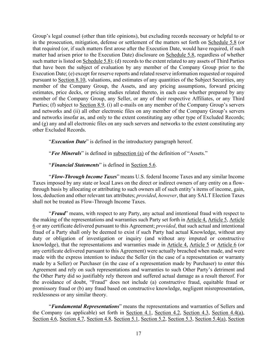 17 Group’s legal counsel (other than title opinions), but excluding records necessary or helpful to or in the prosecution, mitigation, defense or settlement of the matters set forth on Schedule 5.8 (or that required (or, if such matters first arose after the Execution Date, would have required, if such matter had arisen prior to the Execution Date) disclosure on Schedule 5.8, regardless of whether such matter is listed on Schedule 5.8); (d) records to the extent related to any assets of Third Parties that have been the subject of evaluation by any member of the Company Group prior to the Execution Date; (e) except for reserve reports and related reserve information requested or required pursuant to Section 8.10, valuations, and estimates of any quantities of the Subject Securities, any member of the Company Group, the Assets, and any pricing assumptions, forward pricing estimates, price decks, or pricing studies related thereto, in each case whether prepared by any member of the Company Group, any Seller, or any of their respective Affiliates, or any Third Parties; (f) subject to Section 8.9, (i) all e-mails on any member of the Company Group’s servers and networks and (ii) all other electronic files on any member of the Company Group’s servers and networks insofar as, and only to the extent constituting any other type of Excluded Records; and (g) any and all electronic files on any such servers and networks to the extent constituting any other Excluded Records. “Execution Date” is defined in the introductory paragraph hereof. “Fee Minerals” is defined in subsection (a) of the definition of “Assets.” “Financial Statements” is defined in Section 5.6. “Flow-Through Income Taxes” means U.S. federal Income Taxes and any similar Income Taxes imposed by any state or local Laws on the direct or indirect owners of any entity on a flow- through basis by allocating or attributing to such owners all of such entity’s items of income, gain, loss, deduction and other relevant tax attributes; provided, however, that any SALT Election Taxes shall not be treated as Flow-Through Income Taxes. “Fraud” means, with respect to any Party, any actual and intentional fraud with respect to the making of the representations and warranties such Party set forth in Article 4, Article 5, Article 6 or any certificate delivered pursuant to this Agreement; provided, that such actual and intentional fraud of a Party shall only be deemed to exist if such Party had actual Knowledge, without any duty or obligation of investigation or inquiry (and without any imputed or constructive knowledge), that the representations and warranties made in Article 4, Article 5 or Article 6 (or any certificate delivered pursuant to this Agreement) were actually breached when made, and were made with the express intention to induce the Seller (in the case of a representation or warranty made by a Seller) or Purchaser (in the case of a representation made by Purchaser) to enter this Agreement and rely on such representations and warranties to such Other Party’s detriment and the Other Party did so justifiably rely thereon and suffered actual damage as a result thereof. For the avoidance of doubt, “Fraud” does not include (a) constructive fraud, equitable fraud or promissory fraud or (b) any fraud based on constructive knowledge, negligent misrepresentation, recklessness or any similar theory. “Fundamental Representations” means the representations and warranties of Sellers and the Company (as applicable) set forth in Section 4.1, Section 4.2, Section 4.3, Section 4.4(a), Section 4.6, Section 4.7, Section 4.8, Section 5.1, Section 5.2, Section 5.3, Section 5.4(a), Section