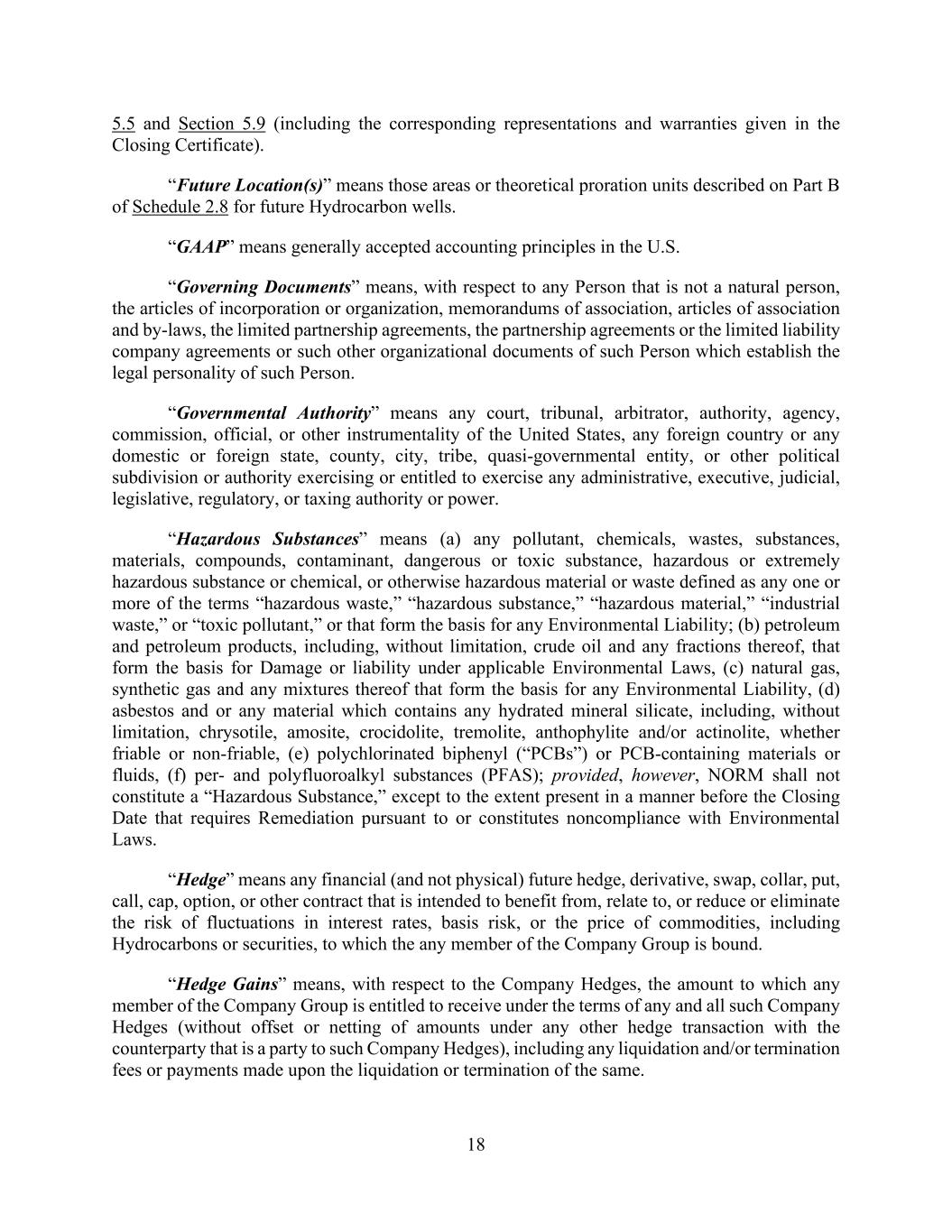 18 5.5 and Section 5.9 (including the corresponding representations and warranties given in the Closing Certificate). “Future Location(s)” means those areas or theoretical proration units described on Part B of Schedule 2.8 for future Hydrocarbon wells. “GAAP” means generally accepted accounting principles in the U.S. “Governing Documents” means, with respect to any Person that is not a natural person, the articles of incorporation or organization, memorandums of association, articles of association and by-laws, the limited partnership agreements, the partnership agreements or the limited liability company agreements or such other organizational documents of such Person which establish the legal personality of such Person. “Governmental Authority” means any court, tribunal, arbitrator, authority, agency, commission, official, or other instrumentality of the United States, any foreign country or any domestic or foreign state, county, city, tribe, quasi-governmental entity, or other political subdivision or authority exercising or entitled to exercise any administrative, executive, judicial, legislative, regulatory, or taxing authority or power. “Hazardous Substances” means (a) any pollutant, chemicals, wastes, substances, materials, compounds, contaminant, dangerous or toxic substance, hazardous or extremely hazardous substance or chemical, or otherwise hazardous material or waste defined as any one or more of the terms “hazardous waste,” “hazardous substance,” “hazardous material,” “industrial waste,” or “toxic pollutant,” or that form the basis for any Environmental Liability; (b) petroleum and petroleum products, including, without limitation, crude oil and any fractions thereof, that form the basis for Damage or liability under applicable Environmental Laws, (c) natural gas, synthetic gas and any mixtures thereof that form the basis for any Environmental Liability, (d) asbestos and or any material which contains any hydrated mineral silicate, including, without limitation, chrysotile, amosite, crocidolite, tremolite, anthophylite and/or actinolite, whether friable or non-friable, (e) polychlorinated biphenyl (“PCBs”) or PCB-containing materials or fluids, (f) per- and polyfluoroalkyl substances (PFAS); provided, however, NORM shall not constitute a “Hazardous Substance,” except to the extent present in a manner before the Closing Date that requires Remediation pursuant to or constitutes noncompliance with Environmental Laws. “Hedge” means any financial (and not physical) future hedge, derivative, swap, collar, put, call, cap, option, or other contract that is intended to benefit from, relate to, or reduce or eliminate the risk of fluctuations in interest rates, basis risk, or the price of commodities, including Hydrocarbons or securities, to which the any member of the Company Group is bound. “Hedge Gains” means, with respect to the Company Hedges, the amount to which any member of the Company Group is entitled to receive under the terms of any and all such Company Hedges (without offset or netting of amounts under any other hedge transaction with the counterparty that is a party to such Company Hedges), including any liquidation and/or termination fees or payments made upon the liquidation or termination of the same.