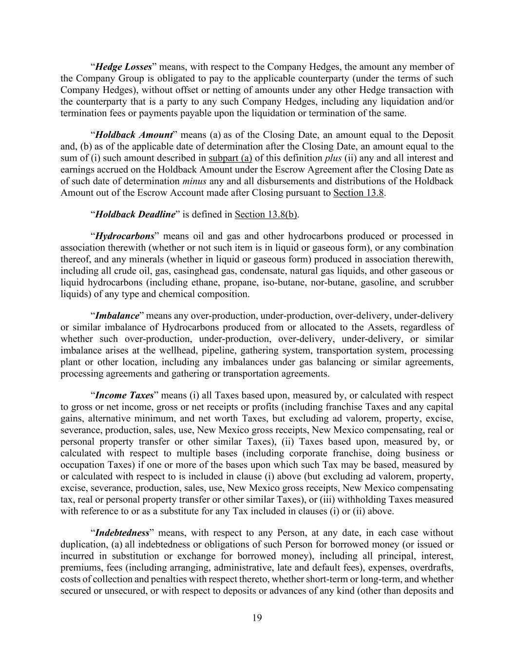 19 “Hedge Losses” means, with respect to the Company Hedges, the amount any member of the Company Group is obligated to pay to the applicable counterparty (under the terms of such Company Hedges), without offset or netting of amounts under any other Hedge transaction with the counterparty that is a party to any such Company Hedges, including any liquidation and/or termination fees or payments payable upon the liquidation or termination of the same. “Holdback Amount” means (a) as of the Closing Date, an amount equal to the Deposit and, (b) as of the applicable date of determination after the Closing Date, an amount equal to the sum of (i) such amount described in subpart (a) of this definition plus (ii) any and all interest and earnings accrued on the Holdback Amount under the Escrow Agreement after the Closing Date as of such date of determination minus any and all disbursements and distributions of the Holdback Amount out of the Escrow Account made after Closing pursuant to Section 13.8. “Holdback Deadline” is defined in Section 13.8(b). “Hydrocarbons” means oil and gas and other hydrocarbons produced or processed in association therewith (whether or not such item is in liquid or gaseous form), or any combination thereof, and any minerals (whether in liquid or gaseous form) produced in association therewith, including all crude oil, gas, casinghead gas, condensate, natural gas liquids, and other gaseous or liquid hydrocarbons (including ethane, propane, iso-butane, nor-butane, gasoline, and scrubber liquids) of any type and chemical composition. “Imbalance” means any over-production, under-production, over-delivery, under-delivery or similar imbalance of Hydrocarbons produced from or allocated to the Assets, regardless of whether such over-production, under-production, over-delivery, under-delivery, or similar imbalance arises at the wellhead, pipeline, gathering system, transportation system, processing plant or other location, including any imbalances under gas balancing or similar agreements, processing agreements and gathering or transportation agreements. “Income Taxes” means (i) all Taxes based upon, measured by, or calculated with respect to gross or net income, gross or net receipts or profits (including franchise Taxes and any capital gains, alternative minimum, and net worth Taxes, but excluding ad valorem, property, excise, severance, production, sales, use, New Mexico gross receipts, New Mexico compensating, real or personal property transfer or other similar Taxes), (ii) Taxes based upon, measured by, or calculated with respect to multiple bases (including corporate franchise, doing business or occupation Taxes) if one or more of the bases upon which such Tax may be based, measured by or calculated with respect to is included in clause (i) above (but excluding ad valorem, property, excise, severance, production, sales, use, New Mexico gross receipts, New Mexico compensating tax, real or personal property transfer or other similar Taxes), or (iii) withholding Taxes measured with reference to or as a substitute for any Tax included in clauses (i) or (ii) above. “Indebtedness” means, with respect to any Person, at any date, in each case without duplication, (a) all indebtedness or obligations of such Person for borrowed money (or issued or incurred in substitution or exchange for borrowed money), including all principal, interest, premiums, fees (including arranging, administrative, late and default fees), expenses, overdrafts, costs of collection and penalties with respect thereto, whether short-term or long-term, and whether secured or unsecured, or with respect to deposits or advances of any kind (other than deposits and