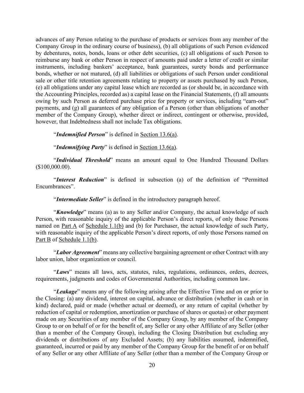 20 advances of any Person relating to the purchase of products or services from any member of the Company Group in the ordinary course of business), (b) all obligations of such Person evidenced by debentures, notes, bonds, loans or other debt securities, (c) all obligations of such Person to reimburse any bank or other Person in respect of amounts paid under a letter of credit or similar instruments, including bankers’ acceptance, bank guarantees, surety bonds and performance bonds, whether or not matured, (d) all liabilities or obligations of such Person under conditional sale or other title retention agreements relating to property or assets purchased by such Person, (e) all obligations under any capital lease which are recorded as (or should be, in accordance with the Accounting Principles, recorded as) a capital lease on the Financial Statements, (f) all amounts owing by such Person as deferred purchase price for property or services, including “earn-out” payments, and (g) all guarantees of any obligation of a Person (other than obligations of another member of the Company Group), whether direct or indirect, contingent or otherwise, provided, however, that Indebtedness shall not include Tax obligations. “Indemnified Person” is defined in Section 13.6(a). “Indemnifying Party” is defined in Section 13.6(a). “Individual Threshold” means an amount equal to One Hundred Thousand Dollars ($100,000.00). “Interest Reduction” is defined in subsection (a) of the definition of “Permitted Encumbrances”. “Intermediate Seller” is defined in the introductory paragraph hereof. “Knowledge” means (a) as to any Seller and/or Company, the actual knowledge of such Person, with reasonable inquiry of the applicable Person’s direct reports, of only those Persons named on Part A of Schedule 1.1(b) and (b) for Purchaser, the actual knowledge of such Party, with reasonable inquiry of the applicable Person’s direct reports, of only those Persons named on Part B of Schedule 1.1(b). “Labor Agreement” means any collective bargaining agreement or other Contract with any labor union, labor organization or council. “Laws” means all laws, acts, statutes, rules, regulations, ordinances, orders, decrees, requirements, judgments and codes of Governmental Authorities, including common law. “Leakage” means any of the following arising after the Effective Time and on or prior to the Closing: (a) any dividend, interest on capital, advance or distribution (whether in cash or in kind) declared, paid or made (whether actual or deemed), or any return of capital (whether by reduction of capital or redemption, amortization or purchase of shares or quotas) or other payment made on any Securities of any member of the Company Group, by any member of the Company Group to or on behalf of or for the benefit of, any Seller or any other Affiliate of any Seller (other than a member of the Company Group), including the Closing Distribution but excluding any dividends or distributions of any Excluded Assets; (b) any liabilities assumed, indemnified, guaranteed, incurred or paid by any member of the Company Group for the benefit of or on behalf of any Seller or any other Affiliate of any Seller (other than a member of the Company Group or