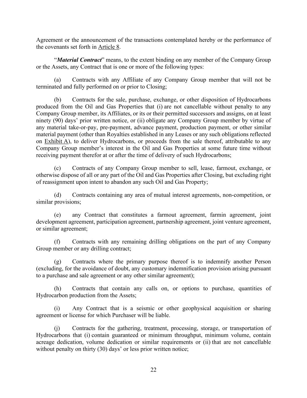 22 Agreement or the announcement of the transactions contemplated hereby or the performance of the covenants set forth in Article 8. “Material Contract” means, to the extent binding on any member of the Company Group or the Assets, any Contract that is one or more of the following types: (a) Contracts with any Affiliate of any Company Group member that will not be terminated and fully performed on or prior to Closing; (b) Contracts for the sale, purchase, exchange, or other disposition of Hydrocarbons produced from the Oil and Gas Properties that (i) are not cancellable without penalty to any Company Group member, its Affiliates, or its or their permitted successors and assigns, on at least ninety (90) days’ prior written notice, or (ii) obligate any Company Group member by virtue of any material take-or-pay, pre-payment, advance payment, production payment, or other similar material payment (other than Royalties established in any Leases or any such obligations reflected on Exhibit A), to deliver Hydrocarbons, or proceeds from the sale thereof, attributable to any Company Group member’s interest in the Oil and Gas Properties at some future time without receiving payment therefor at or after the time of delivery of such Hydrocarbons; (c) Contracts of any Company Group member to sell, lease, farmout, exchange, or otherwise dispose of all or any part of the Oil and Gas Properties after Closing, but excluding right of reassignment upon intent to abandon any such Oil and Gas Property; (d) Contracts containing any area of mutual interest agreements, non-competition, or similar provisions; (e) any Contract that constitutes a farmout agreement, farmin agreement, joint development agreement, participation agreement, partnership agreement, joint venture agreement, or similar agreement; (f) Contracts with any remaining drilling obligations on the part of any Company Group member or any drilling contract; (g) Contracts where the primary purpose thereof is to indemnify another Person (excluding, for the avoidance of doubt, any customary indemnification provision arising pursuant to a purchase and sale agreement or any other similar agreement); (h) Contracts that contain any calls on, or options to purchase, quantities of Hydrocarbon production from the Assets; (i) Any Contract that is a seismic or other geophysical acquisition or sharing agreement or license for which Purchaser will be liable. (j) Contracts for the gathering, treatment, processing, storage, or transportation of Hydrocarbons that (i) contain guaranteed or minimum throughput, minimum volume, contain acreage dedication, volume dedication or similar requirements or (ii) that are not cancellable without penalty on thirty (30) days’ or less prior written notice;