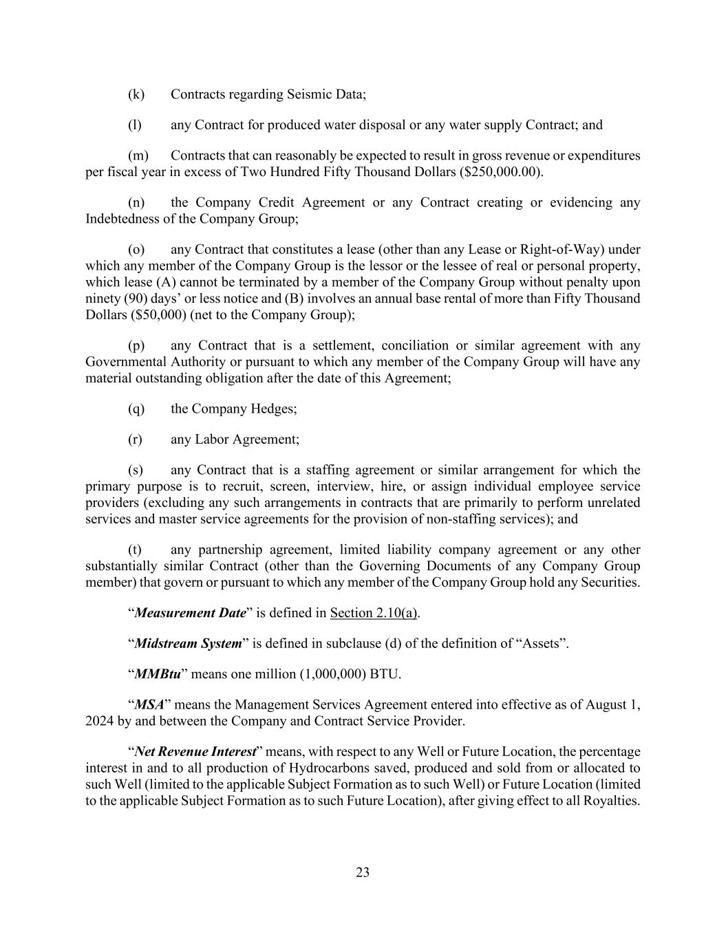 23 (k) Contracts regarding Seismic Data; (l) any Contract for produced water disposal or any water supply Contract; and (m) Contracts that can reasonably be expected to result in gross revenue or expenditures per fiscal year in excess of Two Hundred Fifty Thousand Dollars ($250,000.00). (n) the Company Credit Agreement or any Contract creating or evidencing any Indebtedness of the Company Group; (o) any Contract that constitutes a lease (other than any Lease or Right-of-Way) under which any member of the Company Group is the lessor or the lessee of real or personal property, which lease (A) cannot be terminated by a member of the Company Group without penalty upon ninety (90) days’ or less notice and (B) involves an annual base rental of more than Fifty Thousand Dollars ($50,000) (net to the Company Group); (p) any Contract that is a settlement, conciliation or similar agreement with any Governmental Authority or pursuant to which any member of the Company Group will have any material outstanding obligation after the date of this Agreement; (q) the Company Hedges; (r) any Labor Agreement; (s) any Contract that is a staffing agreement or similar arrangement for which the primary purpose is to recruit, screen, interview, hire, or assign individual employee service providers (excluding any such arrangements in contracts that are primarily to perform unrelated services and master service agreements for the provision of non-staffing services); and (t) any partnership agreement, limited liability company agreement or any other substantially similar Contract (other than the Governing Documents of any Company Group member) that govern or pursuant to which any member of the Company Group hold any Securities. “Measurement Date” is defined in Section 2.10(a). “Midstream System” is defined in subclause (d) of the definition of “Assets”. “MMBtu” means one million (1,000,000) BTU. “MSA” means the Management Services Agreement entered into effective as of August 1, 2024 by and between the Company and Contract Service Provider. “Net Revenue Interest” means, with respect to any Well or Future Location, the percentage interest in and to all production of Hydrocarbons saved, produced and sold from or allocated to such Well (limited to the applicable Subject Formation as to such Well) or Future Location (limited to the applicable Subject Formation as to such Future Location), after giving effect to all Royalties.