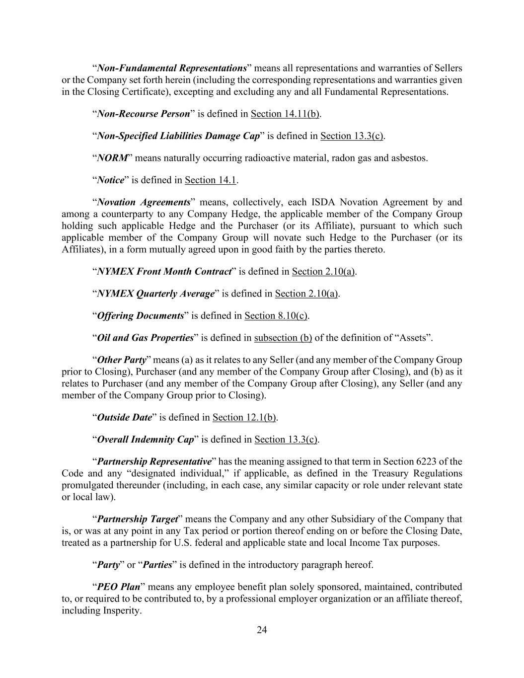 24 “Non-Fundamental Representations” means all representations and warranties of Sellers or the Company set forth herein (including the corresponding representations and warranties given in the Closing Certificate), excepting and excluding any and all Fundamental Representations. “Non-Recourse Person” is defined in Section 14.11(b). “Non-Specified Liabilities Damage Cap” is defined in Section 13.3(c). “NORM” means naturally occurring radioactive material, radon gas and asbestos. “Notice” is defined in Section 14.1. “Novation Agreements” means, collectively, each ISDA Novation Agreement by and among a counterparty to any Company Hedge, the applicable member of the Company Group holding such applicable Hedge and the Purchaser (or its Affiliate), pursuant to which such applicable member of the Company Group will novate such Hedge to the Purchaser (or its Affiliates), in a form mutually agreed upon in good faith by the parties thereto. “NYMEX Front Month Contract” is defined in Section 2.10(a). “NYMEX Quarterly Average” is defined in Section 2.10(a). “Offering Documents” is defined in Section 8.10(c). “Oil and Gas Properties” is defined in subsection (b) of the definition of “Assets”. “Other Party” means (a) as it relates to any Seller (and any member of the Company Group prior to Closing), Purchaser (and any member of the Company Group after Closing), and (b) as it relates to Purchaser (and any member of the Company Group after Closing), any Seller (and any member of the Company Group prior to Closing). “Outside Date” is defined in Section 12.1(b). “Overall Indemnity Cap” is defined in Section 13.3(c). “Partnership Representative” has the meaning assigned to that term in Section 6223 of the Code and any “designated individual,” if applicable, as defined in the Treasury Regulations promulgated thereunder (including, in each case, any similar capacity or role under relevant state or local law). “Partnership Target” means the Company and any other Subsidiary of the Company that is, or was at any point in any Tax period or portion thereof ending on or before the Closing Date, treated as a partnership for U.S. federal and applicable state and local Income Tax purposes. “Party” or “Parties” is defined in the introductory paragraph hereof. “PEO Plan” means any employee benefit plan solely sponsored, maintained, contributed to, or required to be contributed to, by a professional employer organization or an affiliate thereof, including Insperity.