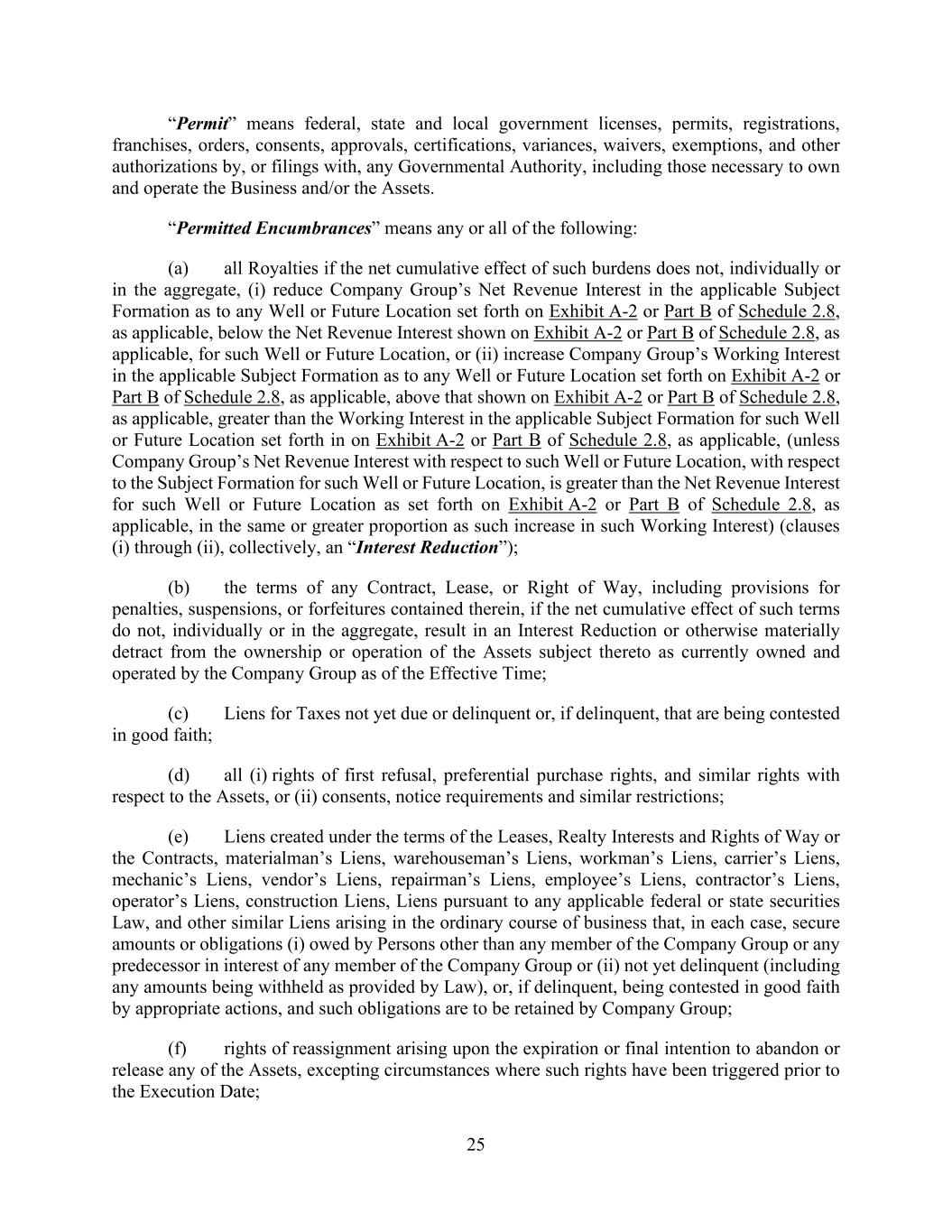 25 “Permit” means federal, state and local government licenses, permits, registrations, franchises, orders, consents, approvals, certifications, variances, waivers, exemptions, and other authorizations by, or filings with, any Governmental Authority, including those necessary to own and operate the Business and/or the Assets. “Permitted Encumbrances” means any or all of the following: (a) all Royalties if the net cumulative effect of such burdens does not, individually or in the aggregate, (i) reduce Company Group’s Net Revenue Interest in the applicable Subject Formation as to any Well or Future Location set forth on Exhibit A-2 or Part B of Schedule 2.8, as applicable, below the Net Revenue Interest shown on Exhibit A-2 or Part B of Schedule 2.8, as applicable, for such Well or Future Location, or (ii) increase Company Group’s Working Interest in the applicable Subject Formation as to any Well or Future Location set forth on Exhibit A-2 or Part B of Schedule 2.8, as applicable, above that shown on Exhibit A-2 or Part B of Schedule 2.8, as applicable, greater than the Working Interest in the applicable Subject Formation for such Well or Future Location set forth in on Exhibit A-2 or Part B of Schedule 2.8, as applicable, (unless Company Group’s Net Revenue Interest with respect to such Well or Future Location, with respect to the Subject Formation for such Well or Future Location, is greater than the Net Revenue Interest for such Well or Future Location as set forth on Exhibit A-2 or Part B of Schedule 2.8, as applicable, in the same or greater proportion as such increase in such Working Interest) (clauses (i) through (ii), collectively, an “Interest Reduction”); (b) the terms of any Contract, Lease, or Right of Way, including provisions for penalties, suspensions, or forfeitures contained therein, if the net cumulative effect of such terms do not, individually or in the aggregate, result in an Interest Reduction or otherwise materially detract from the ownership or operation of the Assets subject thereto as currently owned and operated by the Company Group as of the Effective Time; (c) Liens for Taxes not yet due or delinquent or, if delinquent, that are being contested in good faith; (d) all (i) rights of first refusal, preferential purchase rights, and similar rights with respect to the Assets, or (ii) consents, notice requirements and similar restrictions; (e) Liens created under the terms of the Leases, Realty Interests and Rights of Way or the Contracts, materialman’s Liens, warehouseman’s Liens, workman’s Liens, carrier’s Liens, mechanic’s Liens, vendor’s Liens, repairman’s Liens, employee’s Liens, contractor’s Liens, operator’s Liens, construction Liens, Liens pursuant to any applicable federal or state securities Law, and other similar Liens arising in the ordinary course of business that, in each case, secure amounts or obligations (i) owed by Persons other than any member of the Company Group or any predecessor in interest of any member of the Company Group or (ii) not yet delinquent (including any amounts being withheld as provided by Law), or, if delinquent, being contested in good faith by appropriate actions, and such obligations are to be retained by Company Group; (f) rights of reassignment arising upon the expiration or final intention to abandon or release any of the Assets, excepting circumstances where such rights have been triggered prior to the Execution Date;