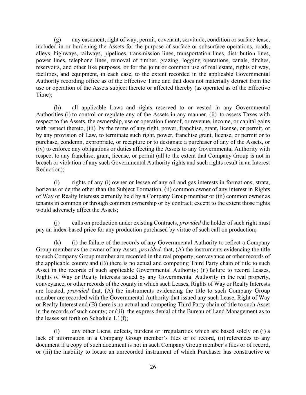 26 (g) any easement, right of way, permit, covenant, servitude, condition or surface lease, included in or burdening the Assets for the purpose of surface or subsurface operations, roads, alleys, highways, railways, pipelines, transmission lines, transportation lines, distribution lines, power lines, telephone lines, removal of timber, grazing, logging operations, canals, ditches, reservoirs, and other like purposes, or for the joint or common use of real estate, rights of way, facilities, and equipment, in each case, to the extent recorded in the applicable Governmental Authority recording office as of the Effective Time and that does not materially detract from the use or operation of the Assets subject thereto or affected thereby (as operated as of the Effective Time); (h) all applicable Laws and rights reserved to or vested in any Governmental Authorities (i) to control or regulate any of the Assets in any manner, (ii) to assess Taxes with respect to the Assets, the ownership, use or operation thereof, or revenue, income, or capital gains with respect thereto, (iii) by the terms of any right, power, franchise, grant, license, or permit, or by any provision of Law, to terminate such right, power, franchise grant, license, or permit or to purchase, condemn, expropriate, or recapture or to designate a purchaser of any of the Assets, or (iv) to enforce any obligations or duties affecting the Assets to any Governmental Authority with respect to any franchise, grant, license, or permit (all to the extent that Company Group is not in breach or violation of any such Governmental Authority rights and such rights result in an Interest Reduction); (i) rights of any (i) owner or lessee of any oil and gas interests in formations, strata, horizons or depths other than the Subject Formation, (ii) common owner of any interest in Rights of Way or Realty Interests currently held by a Company Group member or (iii) common owner as tenants in common or through common ownership or by contract; except to the extent those rights would adversely affect the Assets; (j) calls on production under existing Contracts, provided the holder of such right must pay an index-based price for any production purchased by virtue of such call on production; (k) (i) the failure of the records of any Governmental Authority to reflect a Company Group member as the owner of any Asset, provided, that, (A) the instruments evidencing the title to such Company Group member are recorded in the real property, conveyance or other records of the applicable county and (B) there is no actual and competing Third Party chain of title to such Asset in the records of such applicable Governmental Authority; (ii) failure to record Leases, Rights of Way or Realty Interests issued by any Governmental Authority in the real property, conveyance, or other records of the county in which such Leases, Rights of Way or Realty Interests are located, provided that, (A) the instruments evidencing the title to such Company Group member are recorded with the Governmental Authority that issued any such Lease, Right of Way or Realty Interest and (B) there is no actual and competing Third Party chain of title to such Asset in the records of such county; or (iii) the express denial of the Bureau of Land Management as to the leases set forth on Schedule 1.1(f); (l) any other Liens, defects, burdens or irregularities which are based solely on (i) a lack of information in a Company Group member’s files or of record, (ii) references to any document if a copy of such document is not in such Company Group member’s files or of record, or (iii) the inability to locate an unrecorded instrument of which Purchaser has constructive or