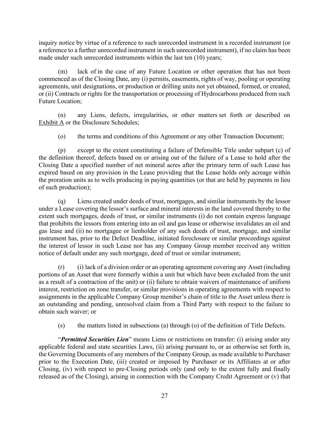 27 inquiry notice by virtue of a reference to such unrecorded instrument in a recorded instrument (or a reference to a further unrecorded instrument in such unrecorded instrument), if no claim has been made under such unrecorded instruments within the last ten (10) years; (m) lack of in the case of any Future Location or other operation that has not been commenced as of the Closing Date, any (i) permits, easements, rights of way, pooling or operating agreements, unit designations, or production or drilling units not yet obtained, formed, or created, or (ii) Contracts or rights for the transportation or processing of Hydrocarbons produced from such Future Location; (n) any Liens, defects, irregularities, or other matters set forth or described on Exhibit A or the Disclosure Schedules; (o) the terms and conditions of this Agreement or any other Transaction Document; (p) except to the extent constituting a failure of Defensible Title under subpart (c) of the definition thereof, defects based on or arising out of the failure of a Lease to hold after the Closing Date a specified number of net mineral acres after the primary term of such Lease has expired based on any provision in the Lease providing that the Lease holds only acreage within the proration units as to wells producing in paying quantities (or that are held by payments in lieu of such production); (q) Liens created under deeds of trust, mortgages, and similar instruments by the lessor under a Lease covering the lessor’s surface and mineral interests in the land covered thereby to the extent such mortgages, deeds of trust, or similar instruments (i) do not contain express language that prohibits the lessors from entering into an oil and gas lease or otherwise invalidates an oil and gas lease and (ii) no mortgagee or lienholder of any such deeds of trust, mortgage, and similar instrument has, prior to the Defect Deadline, initiated foreclosure or similar proceedings against the interest of lessor in such Lease nor has any Company Group member received any written notice of default under any such mortgage, deed of trust or similar instrument; (r) (i) lack of a division order or an operating agreement covering any Asset (including portions of an Asset that were formerly within a unit but which have been excluded from the unit as a result of a contraction of the unit) or (ii) failure to obtain waivers of maintenance of uniform interest, restriction on zone transfer, or similar provisions in operating agreements with respect to assignments in the applicable Company Group member’s chain of title to the Asset unless there is an outstanding and pending, unresolved claim from a Third Party with respect to the failure to obtain such waiver; or (s) the matters listed in subsections (a) through (o) of the definition of Title Defects. “Permitted Securities Lien” means Liens or restrictions on transfer: (i) arising under any applicable federal and state securities Laws, (ii) arising pursuant to, or as otherwise set forth in, the Governing Documents of any members of the Company Group, as made available to Purchaser prior to the Execution Date, (iii) created or imposed by Purchaser or its Affiliates at or after Closing, (iv) with respect to pre-Closing periods only (and only to the extent fully and finally released as of the Closing), arising in connection with the Company Credit Agreement or (v) that