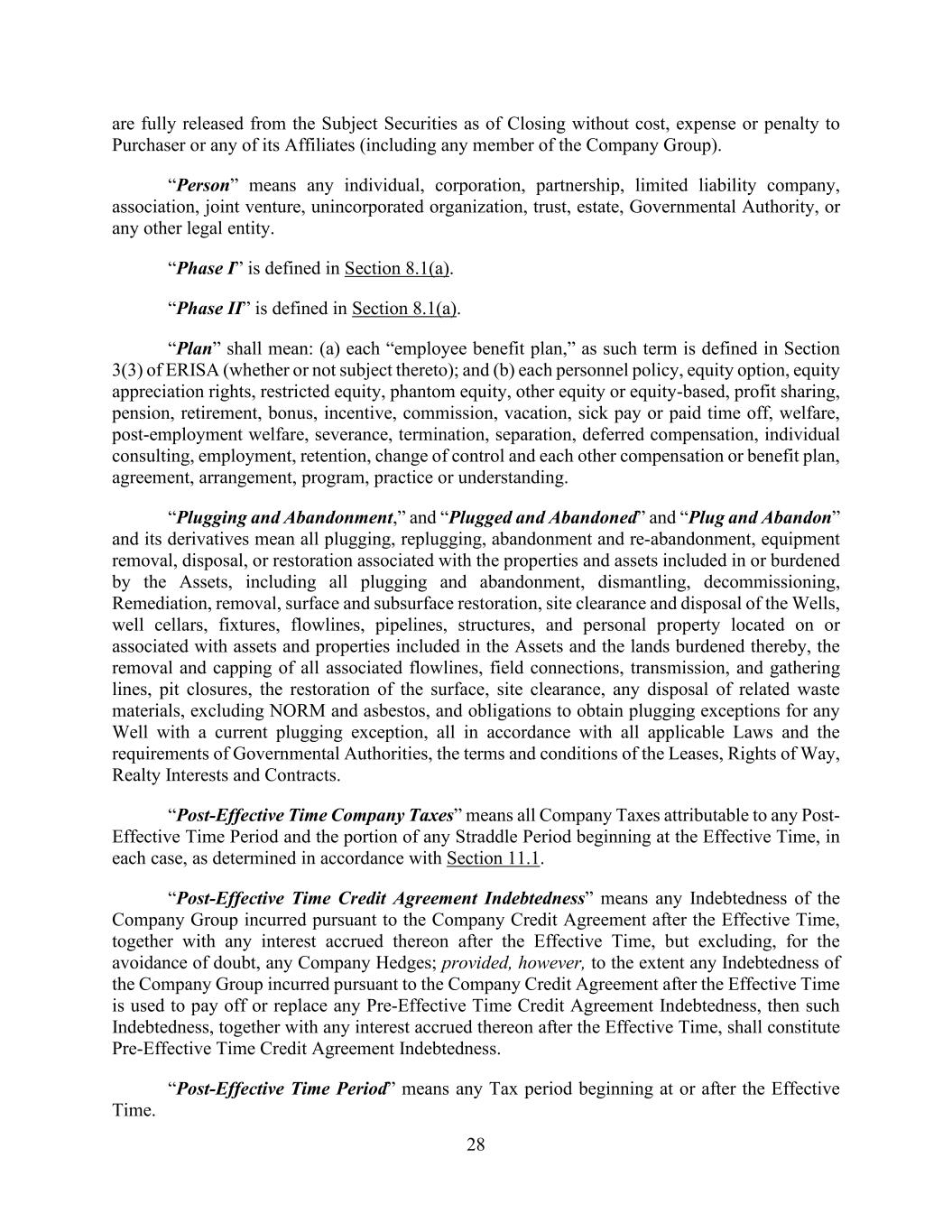 28 are fully released from the Subject Securities as of Closing without cost, expense or penalty to Purchaser or any of its Affiliates (including any member of the Company Group). “Person” means any individual, corporation, partnership, limited liability company, association, joint venture, unincorporated organization, trust, estate, Governmental Authority, or any other legal entity. “Phase I” is defined in Section 8.1(a). “Phase II” is defined in Section 8.1(a). “Plan” shall mean: (a) each “employee benefit plan,” as such term is defined in Section 3(3) of ERISA (whether or not subject thereto); and (b) each personnel policy, equity option, equity appreciation rights, restricted equity, phantom equity, other equity or equity-based, profit sharing, pension, retirement, bonus, incentive, commission, vacation, sick pay or paid time off, welfare, post-employment welfare, severance, termination, separation, deferred compensation, individual consulting, employment, retention, change of control and each other compensation or benefit plan, agreement, arrangement, program, practice or understanding. “Plugging and Abandonment,” and “Plugged and Abandoned” and “Plug and Abandon” and its derivatives mean all plugging, replugging, abandonment and re-abandonment, equipment removal, disposal, or restoration associated with the properties and assets included in or burdened by the Assets, including all plugging and abandonment, dismantling, decommissioning, Remediation, removal, surface and subsurface restoration, site clearance and disposal of the Wells, well cellars, fixtures, flowlines, pipelines, structures, and personal property located on or associated with assets and properties included in the Assets and the lands burdened thereby, the removal and capping of all associated flowlines, field connections, transmission, and gathering lines, pit closures, the restoration of the surface, site clearance, any disposal of related waste materials, excluding NORM and asbestos, and obligations to obtain plugging exceptions for any Well with a current plugging exception, all in accordance with all applicable Laws and the requirements of Governmental Authorities, the terms and conditions of the Leases, Rights of Way, Realty Interests and Contracts. “Post-Effective Time Company Taxes” means all Company Taxes attributable to any Post- Effective Time Period and the portion of any Straddle Period beginning at the Effective Time, in each case, as determined in accordance with Section 11.1. “Post-Effective Time Credit Agreement Indebtedness” means any Indebtedness of the Company Group incurred pursuant to the Company Credit Agreement after the Effective Time, together with any interest accrued thereon after the Effective Time, but excluding, for the avoidance of doubt, any Company Hedges; provided, however, to the extent any Indebtedness of the Company Group incurred pursuant to the Company Credit Agreement after the Effective Time is used to pay off or replace any Pre-Effective Time Credit Agreement Indebtedness, then such Indebtedness, together with any interest accrued thereon after the Effective Time, shall constitute Pre-Effective Time Credit Agreement Indebtedness. “Post-Effective Time Period” means any Tax period beginning at or after the Effective Time.