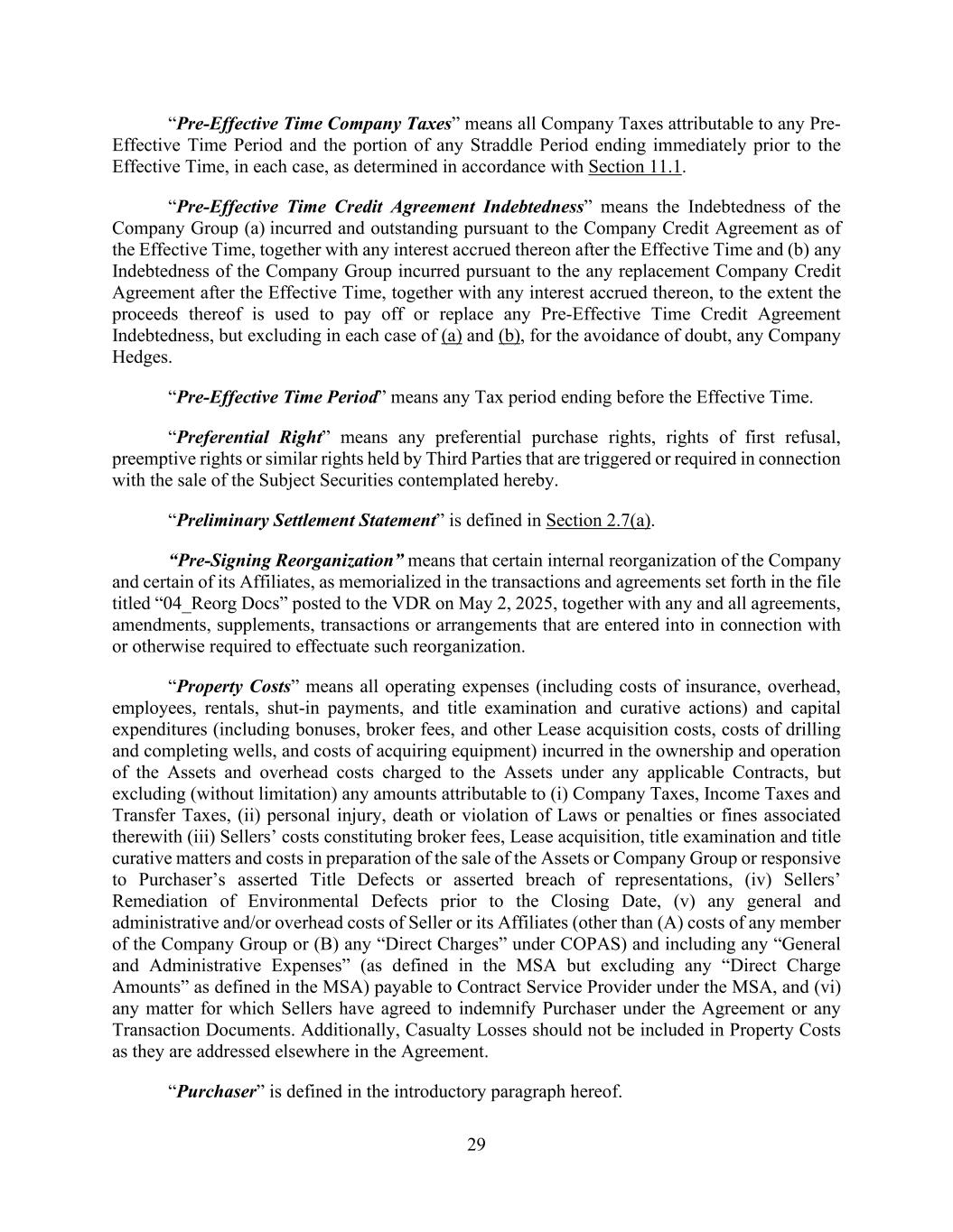 29 “Pre-Effective Time Company Taxes” means all Company Taxes attributable to any Pre- Effective Time Period and the portion of any Straddle Period ending immediately prior to the Effective Time, in each case, as determined in accordance with Section 11.1. “Pre-Effective Time Credit Agreement Indebtedness” means the Indebtedness of the Company Group (a) incurred and outstanding pursuant to the Company Credit Agreement as of the Effective Time, together with any interest accrued thereon after the Effective Time and (b) any Indebtedness of the Company Group incurred pursuant to the any replacement Company Credit Agreement after the Effective Time, together with any interest accrued thereon, to the extent the proceeds thereof is used to pay off or replace any Pre-Effective Time Credit Agreement Indebtedness, but excluding in each case of (a) and (b), for the avoidance of doubt, any Company Hedges. “Pre-Effective Time Period” means any Tax period ending before the Effective Time. “Preferential Right” means any preferential purchase rights, rights of first refusal, preemptive rights or similar rights held by Third Parties that are triggered or required in connection with the sale of the Subject Securities contemplated hereby. “Preliminary Settlement Statement” is defined in Section 2.7(a). “Pre-Signing Reorganization” means that certain internal reorganization of the Company and certain of its Affiliates, as memorialized in the transactions and agreements set forth in the file titled “04_Reorg Docs” posted to the VDR on May 2, 2025, together with any and all agreements, amendments, supplements, transactions or arrangements that are entered into in connection with or otherwise required to effectuate such reorganization. “Property Costs” means all operating expenses (including costs of insurance, overhead, employees, rentals, shut-in payments, and title examination and curative actions) and capital expenditures (including bonuses, broker fees, and other Lease acquisition costs, costs of drilling and completing wells, and costs of acquiring equipment) incurred in the ownership and operation of the Assets and overhead costs charged to the Assets under any applicable Contracts, but excluding (without limitation) any amounts attributable to (i) Company Taxes, Income Taxes and Transfer Taxes, (ii) personal injury, death or violation of Laws or penalties or fines associated therewith (iii) Sellers’ costs constituting broker fees, Lease acquisition, title examination and title curative matters and costs in preparation of the sale of the Assets or Company Group or responsive to Purchaser’s asserted Title Defects or asserted breach of representations, (iv) Sellers’ Remediation of Environmental Defects prior to the Closing Date, (v) any general and administrative and/or overhead costs of Seller or its Affiliates (other than (A) costs of any member of the Company Group or (B) any “Direct Charges” under COPAS) and including any “General and Administrative Expenses” (as defined in the MSA but excluding any “Direct Charge Amounts” as defined in the MSA) payable to Contract Service Provider under the MSA, and (vi) any matter for which Sellers have agreed to indemnify Purchaser under the Agreement or any Transaction Documents. Additionally, Casualty Losses should not be included in Property Costs as they are addressed elsewhere in the Agreement. “Purchaser” is defined in the introductory paragraph hereof.