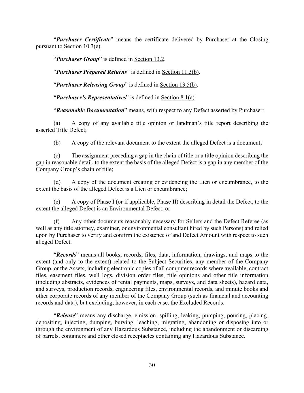 30 “Purchaser Certificate” means the certificate delivered by Purchaser at the Closing pursuant to Section 10.3(e). “Purchaser Group” is defined in Section 13.2. “Purchaser Prepared Returns” is defined in Section 11.3(b). “Purchaser Releasing Group” is defined in Section 13.5(b). “Purchaser’s Representatives” is defined in Section 8.1(a). “Reasonable Documentation” means, with respect to any Defect asserted by Purchaser: (a) A copy of any available title opinion or landman’s title report describing the asserted Title Defect; (b) A copy of the relevant document to the extent the alleged Defect is a document; (c) The assignment preceding a gap in the chain of title or a title opinion describing the gap in reasonable detail, to the extent the basis of the alleged Defect is a gap in any member of the Company Group’s chain of title; (d) A copy of the document creating or evidencing the Lien or encumbrance, to the extent the basis of the alleged Defect is a Lien or encumbrance; (e) A copy of Phase I (or if applicable, Phase II) describing in detail the Defect, to the extent the alleged Defect is an Environmental Defect; or (f) Any other documents reasonably necessary for Sellers and the Defect Referee (as well as any title attorney, examiner, or environmental consultant hired by such Persons) and relied upon by Purchaser to verify and confirm the existence of and Defect Amount with respect to such alleged Defect. “Records” means all books, records, files, data, information, drawings, and maps to the extent (and only to the extent) related to the Subject Securities, any member of the Company Group, or the Assets, including electronic copies of all computer records where available, contract files, easement files, well logs, division order files, title opinions and other title information (including abstracts, evidences of rental payments, maps, surveys, and data sheets), hazard data, and surveys, production records, engineering files, environmental records, and minute books and other corporate records of any member of the Company Group (such as financial and accounting records and data), but excluding, however, in each case, the Excluded Records. “Release” means any discharge, emission, spilling, leaking, pumping, pouring, placing, depositing, injecting, dumping, burying, leaching, migrating, abandoning or disposing into or through the environment of any Hazardous Substance, including the abandonment or discarding of barrels, containers and other closed receptacles containing any Hazardous Substance.