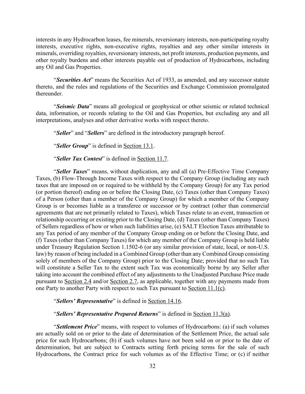 32 interests in any Hydrocarbon leases, fee minerals, reversionary interests, non-participating royalty interests, executive rights, non-executive rights, royalties and any other similar interests in minerals, overriding royalties, reversionary interests, net profit interests, production payments, and other royalty burdens and other interests payable out of production of Hydrocarbons, including any Oil and Gas Properties. “Securities Act” means the Securities Act of 1933, as amended, and any successor statute thereto, and the rules and regulations of the Securities and Exchange Commission promulgated thereunder. “Seismic Data” means all geological or geophysical or other seismic or related technical data, information, or records relating to the Oil and Gas Properties, but excluding any and all interpretations, analyses and other derivative works with respect thereto. “Seller” and “Sellers” are defined in the introductory paragraph hereof. “Seller Group” is defined in Section 13.1. “Seller Tax Contest” is defined in Section 11.7. “Seller Taxes” means, without duplication, any and all (a) Pre-Effective Time Company Taxes, (b) Flow-Through Income Taxes with respect to the Company Group (including any such taxes that are imposed on or required to be withheld by the Company Group) for any Tax period (or portion thereof) ending on or before the Closing Date, (c) Taxes (other than Company Taxes) of a Person (other than a member of the Company Group) for which a member of the Company Group is or becomes liable as a transferee or successor or by contract (other than commercial agreements that are not primarily related to Taxes), which Taxes relate to an event, transaction or relationship occurring or existing prior to the Closing Date, (d) Taxes (other than Company Taxes) of Sellers regardless of how or when such liabilities arise, (e) SALT Election Taxes attributable to any Tax period of any member of the Company Group ending on or before the Closing Date, and (f) Taxes (other than Company Taxes) for which any member of the Company Group is held liable under Treasury Regulation Section 1.1502-6 (or any similar provision of state, local, or non-U.S. law) by reason of being included in a Combined Group (other than any Combined Group consisting solely of members of the Company Group) prior to the Closing Date; provided that no such Tax will constitute a Seller Tax to the extent such Tax was economically borne by any Seller after taking into account the combined effect of any adjustments to the Unadjusted Purchase Price made pursuant to Section 2.4 and/or Section 2.7, as applicable, together with any payments made from one Party to another Party with respect to such Tax pursuant to Section 11.1(c). “Sellers’ Representative” is defined in Section 14.16. “Sellers’ Representative Prepared Returns” is defined in Section 11.3(a). “Settlement Price” means, with respect to volumes of Hydrocarbons: (a) if such volumes are actually sold on or prior to the date of determination of the Settlement Price, the actual sale price for such Hydrocarbons; (b) if such volumes have not been sold on or prior to the date of determination, but are subject to Contracts setting forth pricing terms for the sale of such Hydrocarbons, the Contract price for such volumes as of the Effective Time; or (c) if neither
