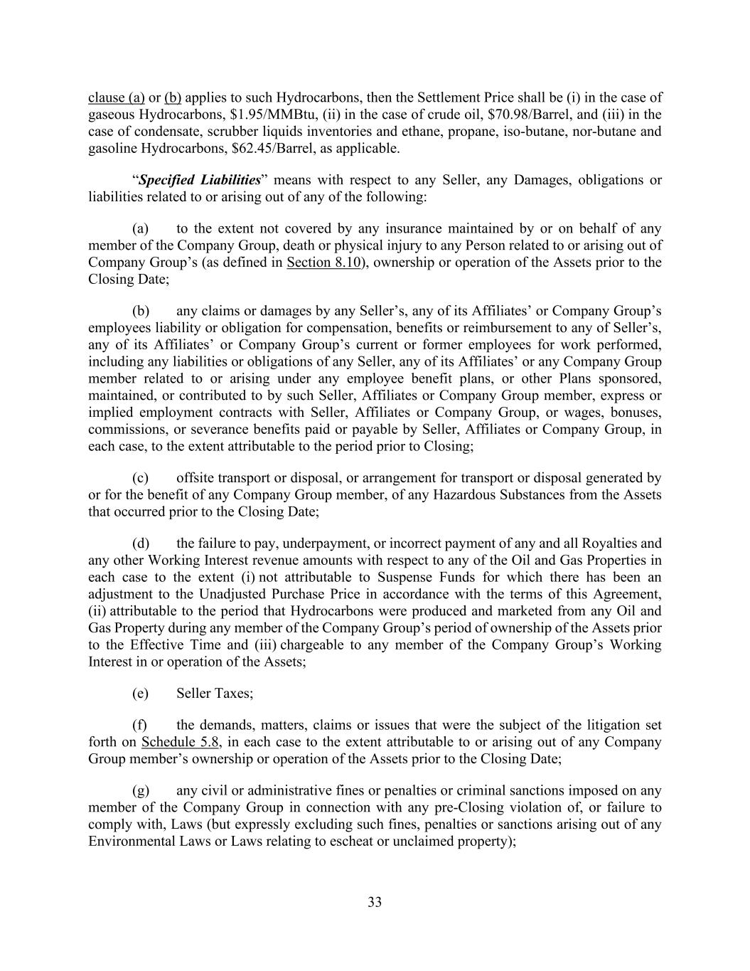 33 clause (a) or (b) applies to such Hydrocarbons, then the Settlement Price shall be (i) in the case of gaseous Hydrocarbons, $1.95/MMBtu, (ii) in the case of crude oil, $70.98/Barrel, and (iii) in the case of condensate, scrubber liquids inventories and ethane, propane, iso-butane, nor-butane and gasoline Hydrocarbons, $62.45/Barrel, as applicable. “Specified Liabilities” means with respect to any Seller, any Damages, obligations or liabilities related to or arising out of any of the following: (a) to the extent not covered by any insurance maintained by or on behalf of any member of the Company Group, death or physical injury to any Person related to or arising out of Company Group’s (as defined in Section 8.10), ownership or operation of the Assets prior to the Closing Date; (b) any claims or damages by any Seller’s, any of its Affiliates’ or Company Group’s employees liability or obligation for compensation, benefits or reimbursement to any of Seller’s, any of its Affiliates’ or Company Group’s current or former employees for work performed, including any liabilities or obligations of any Seller, any of its Affiliates’ or any Company Group member related to or arising under any employee benefit plans, or other Plans sponsored, maintained, or contributed to by such Seller, Affiliates or Company Group member, express or implied employment contracts with Seller, Affiliates or Company Group, or wages, bonuses, commissions, or severance benefits paid or payable by Seller, Affiliates or Company Group, in each case, to the extent attributable to the period prior to Closing; (c) offsite transport or disposal, or arrangement for transport or disposal generated by or for the benefit of any Company Group member, of any Hazardous Substances from the Assets that occurred prior to the Closing Date; (d) the failure to pay, underpayment, or incorrect payment of any and all Royalties and any other Working Interest revenue amounts with respect to any of the Oil and Gas Properties in each case to the extent (i) not attributable to Suspense Funds for which there has been an adjustment to the Unadjusted Purchase Price in accordance with the terms of this Agreement, (ii) attributable to the period that Hydrocarbons were produced and marketed from any Oil and Gas Property during any member of the Company Group’s period of ownership of the Assets prior to the Effective Time and (iii) chargeable to any member of the Company Group’s Working Interest in or operation of the Assets; (e) Seller Taxes; (f) the demands, matters, claims or issues that were the subject of the litigation set forth on Schedule 5.8, in each case to the extent attributable to or arising out of any Company Group member’s ownership or operation of the Assets prior to the Closing Date; (g) any civil or administrative fines or penalties or criminal sanctions imposed on any member of the Company Group in connection with any pre-Closing violation of, or failure to comply with, Laws (but expressly excluding such fines, penalties or sanctions arising out of any Environmental Laws or Laws relating to escheat or unclaimed property);