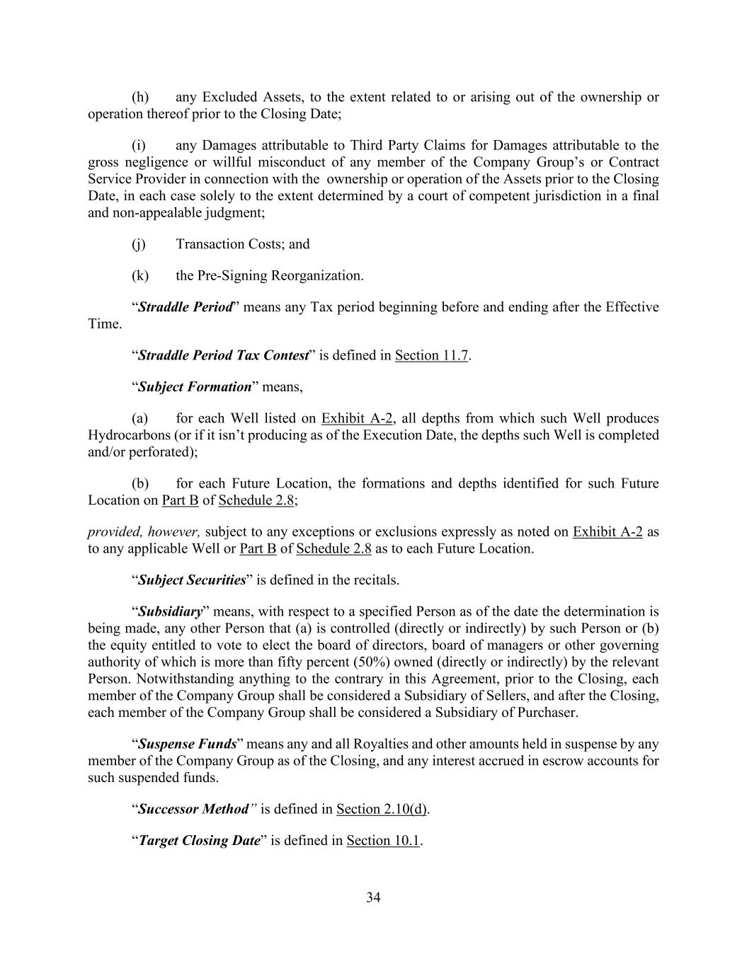 34 (h) any Excluded Assets, to the extent related to or arising out of the ownership or operation thereof prior to the Closing Date; (i) any Damages attributable to Third Party Claims for Damages attributable to the gross negligence or willful misconduct of any member of the Company Group’s or Contract Service Provider in connection with the ownership or operation of the Assets prior to the Closing Date, in each case solely to the extent determined by a court of competent jurisdiction in a final and non-appealable judgment; (j) Transaction Costs; and (k) the Pre-Signing Reorganization. “Straddle Period” means any Tax period beginning before and ending after the Effective Time. “Straddle Period Tax Contest” is defined in Section 11.7. “Subject Formation” means, (a) for each Well listed on Exhibit A-2, all depths from which such Well produces Hydrocarbons (or if it isn’t producing as of the Execution Date, the depths such Well is completed and/or perforated); (b) for each Future Location, the formations and depths identified for such Future Location on Part B of Schedule 2.8; provided, however, subject to any exceptions or exclusions expressly as noted on Exhibit A-2 as to any applicable Well or Part B of Schedule 2.8 as to each Future Location. “Subject Securities” is defined in the recitals. “Subsidiary” means, with respect to a specified Person as of the date the determination is being made, any other Person that (a) is controlled (directly or indirectly) by such Person or (b) the equity entitled to vote to elect the board of directors, board of managers or other governing authority of which is more than fifty percent (50%) owned (directly or indirectly) by the relevant Person. Notwithstanding anything to the contrary in this Agreement, prior to the Closing, each member of the Company Group shall be considered a Subsidiary of Sellers, and after the Closing, each member of the Company Group shall be considered a Subsidiary of Purchaser. “Suspense Funds” means any and all Royalties and other amounts held in suspense by any member of the Company Group as of the Closing, and any interest accrued in escrow accounts for such suspended funds. “Successor Method” is defined in Section 2.10(d). “Target Closing Date” is defined in Section 10.1.