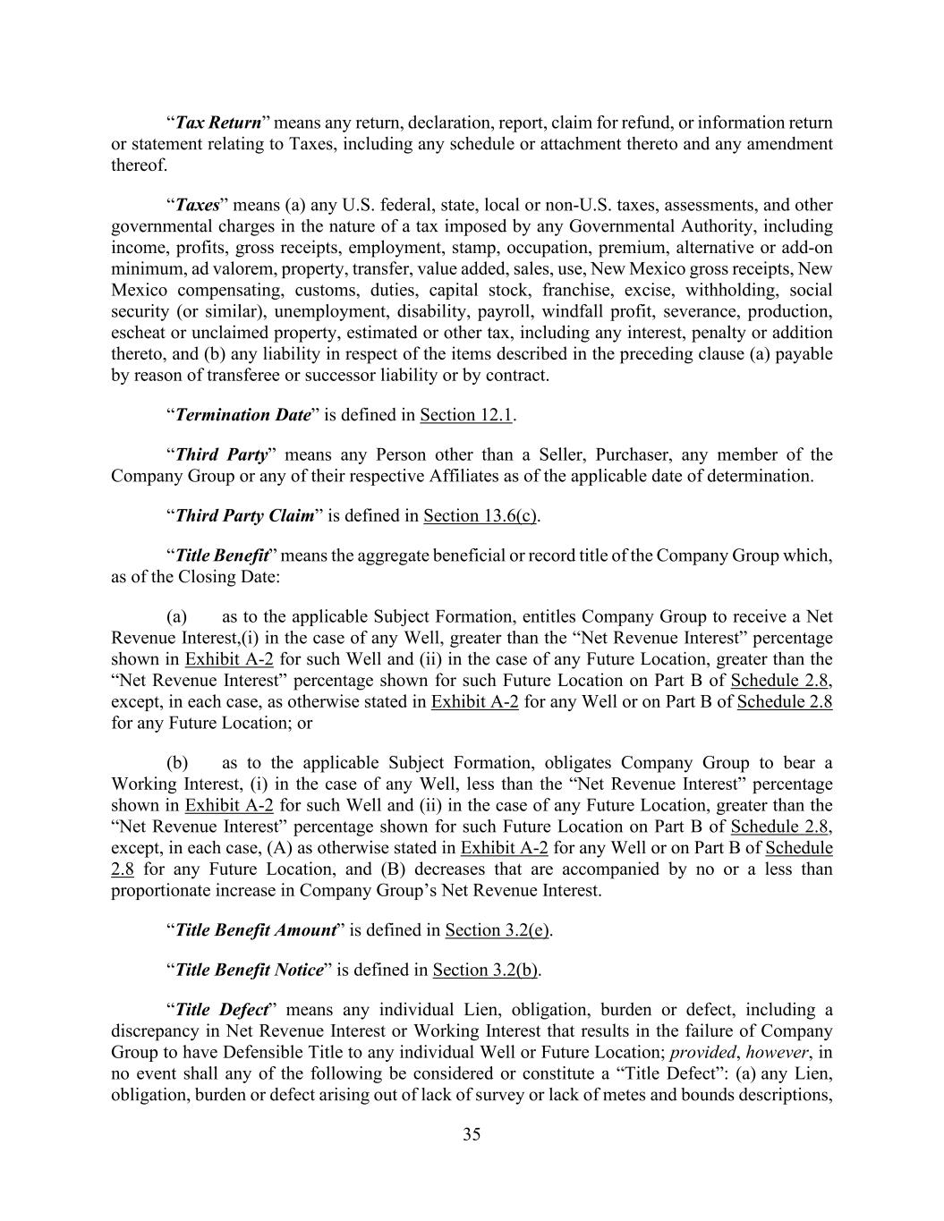 35 “Tax Return” means any return, declaration, report, claim for refund, or information return or statement relating to Taxes, including any schedule or attachment thereto and any amendment thereof. “Taxes” means (a) any U.S. federal, state, local or non-U.S. taxes, assessments, and other governmental charges in the nature of a tax imposed by any Governmental Authority, including income, profits, gross receipts, employment, stamp, occupation, premium, alternative or add-on minimum, ad valorem, property, transfer, value added, sales, use, New Mexico gross receipts, New Mexico compensating, customs, duties, capital stock, franchise, excise, withholding, social security (or similar), unemployment, disability, payroll, windfall profit, severance, production, escheat or unclaimed property, estimated or other tax, including any interest, penalty or addition thereto, and (b) any liability in respect of the items described in the preceding clause (a) payable by reason of transferee or successor liability or by contract. “Termination Date” is defined in Section 12.1. “Third Party” means any Person other than a Seller, Purchaser, any member of the Company Group or any of their respective Affiliates as of the applicable date of determination. “Third Party Claim” is defined in Section 13.6(c). “Title Benefit” means the aggregate beneficial or record title of the Company Group which, as of the Closing Date: (a) as to the applicable Subject Formation, entitles Company Group to receive a Net Revenue Interest,(i) in the case of any Well, greater than the “Net Revenue Interest” percentage shown in Exhibit A-2 for such Well and (ii) in the case of any Future Location, greater than the “Net Revenue Interest” percentage shown for such Future Location on Part B of Schedule 2.8, except, in each case, as otherwise stated in Exhibit A-2 for any Well or on Part B of Schedule 2.8 for any Future Location; or (b) as to the applicable Subject Formation, obligates Company Group to bear a Working Interest, (i) in the case of any Well, less than the “Net Revenue Interest” percentage shown in Exhibit A-2 for such Well and (ii) in the case of any Future Location, greater than the “Net Revenue Interest” percentage shown for such Future Location on Part B of Schedule 2.8, except, in each case, (A) as otherwise stated in Exhibit A-2 for any Well or on Part B of Schedule 2.8 for any Future Location, and (B) decreases that are accompanied by no or a less than proportionate increase in Company Group’s Net Revenue Interest. “Title Benefit Amount” is defined in Section 3.2(e). “Title Benefit Notice” is defined in Section 3.2(b). “Title Defect” means any individual Lien, obligation, burden or defect, including a discrepancy in Net Revenue Interest or Working Interest that results in the failure of Company Group to have Defensible Title to any individual Well or Future Location; provided, however, in no event shall any of the following be considered or constitute a “Title Defect”: (a) any Lien, obligation, burden or defect arising out of lack of survey or lack of metes and bounds descriptions,
