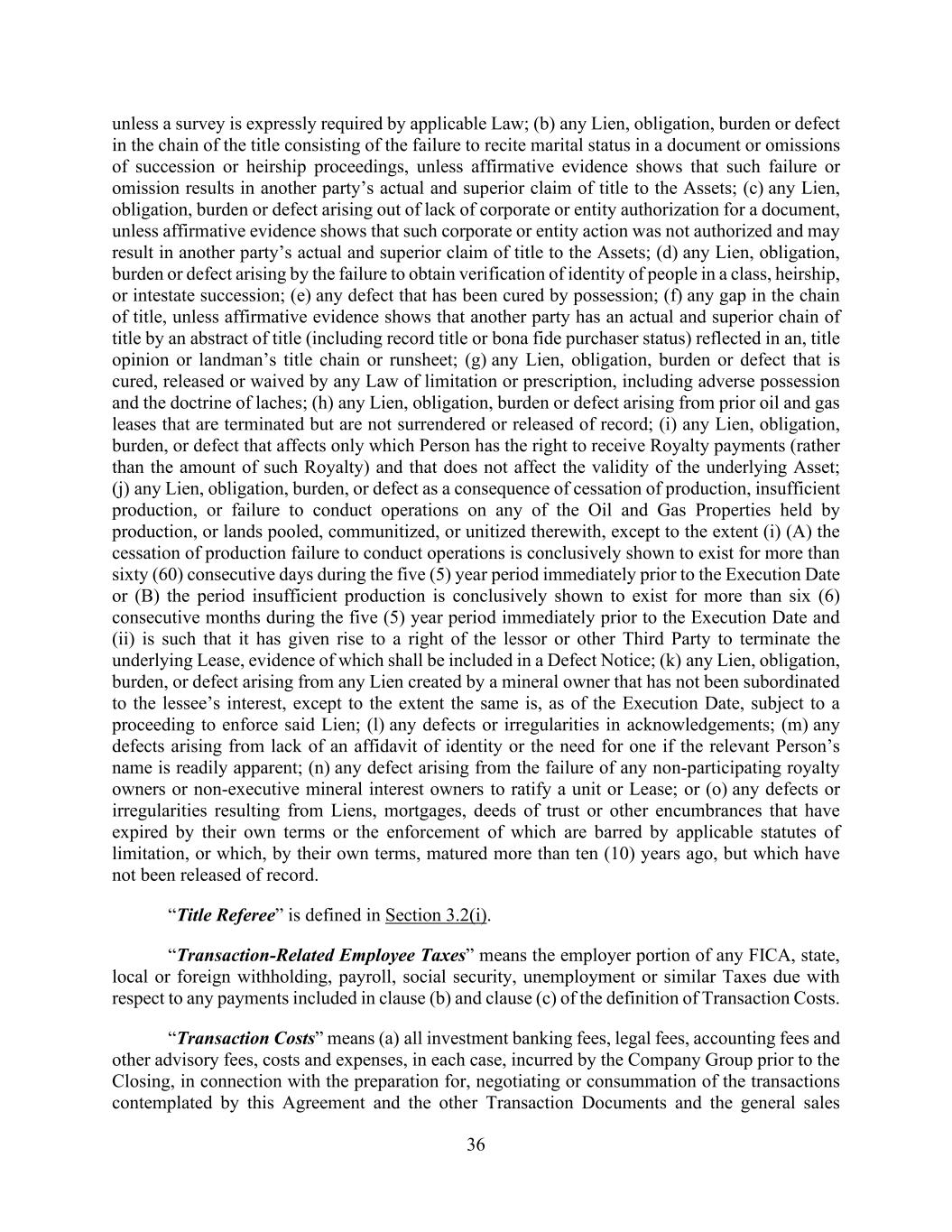 36 unless a survey is expressly required by applicable Law; (b) any Lien, obligation, burden or defect in the chain of the title consisting of the failure to recite marital status in a document or omissions of succession or heirship proceedings, unless affirmative evidence shows that such failure or omission results in another party’s actual and superior claim of title to the Assets; (c) any Lien, obligation, burden or defect arising out of lack of corporate or entity authorization for a document, unless affirmative evidence shows that such corporate or entity action was not authorized and may result in another party’s actual and superior claim of title to the Assets; (d) any Lien, obligation, burden or defect arising by the failure to obtain verification of identity of people in a class, heirship, or intestate succession; (e) any defect that has been cured by possession; (f) any gap in the chain of title, unless affirmative evidence shows that another party has an actual and superior chain of title by an abstract of title (including record title or bona fide purchaser status) reflected in an, title opinion or landman’s title chain or runsheet; (g) any Lien, obligation, burden or defect that is cured, released or waived by any Law of limitation or prescription, including adverse possession and the doctrine of laches; (h) any Lien, obligation, burden or defect arising from prior oil and gas leases that are terminated but are not surrendered or released of record; (i) any Lien, obligation, burden, or defect that affects only which Person has the right to receive Royalty payments (rather than the amount of such Royalty) and that does not affect the validity of the underlying Asset; (j) any Lien, obligation, burden, or defect as a consequence of cessation of production, insufficient production, or failure to conduct operations on any of the Oil and Gas Properties held by production, or lands pooled, communitized, or unitized therewith, except to the extent (i) (A) the cessation of production failure to conduct operations is conclusively shown to exist for more than sixty (60) consecutive days during the five (5) year period immediately prior to the Execution Date or (B) the period insufficient production is conclusively shown to exist for more than six (6) consecutive months during the five (5) year period immediately prior to the Execution Date and (ii) is such that it has given rise to a right of the lessor or other Third Party to terminate the underlying Lease, evidence of which shall be included in a Defect Notice; (k) any Lien, obligation, burden, or defect arising from any Lien created by a mineral owner that has not been subordinated to the lessee’s interest, except to the extent the same is, as of the Execution Date, subject to a proceeding to enforce said Lien; (l) any defects or irregularities in acknowledgements; (m) any defects arising from lack of an affidavit of identity or the need for one if the relevant Person’s name is readily apparent; (n) any defect arising from the failure of any non-participating royalty owners or non-executive mineral interest owners to ratify a unit or Lease; or (o) any defects or irregularities resulting from Liens, mortgages, deeds of trust or other encumbrances that have expired by their own terms or the enforcement of which are barred by applicable statutes of limitation, or which, by their own terms, matured more than ten (10) years ago, but which have not been released of record. “Title Referee” is defined in Section 3.2(i). “Transaction-Related Employee Taxes” means the employer portion of any FICA, state, local or foreign withholding, payroll, social security, unemployment or similar Taxes due with respect to any payments included in clause (b) and clause (c) of the definition of Transaction Costs. “Transaction Costs” means (a) all investment banking fees, legal fees, accounting fees and other advisory fees, costs and expenses, in each case, incurred by the Company Group prior to the Closing, in connection with the preparation for, negotiating or consummation of the transactions contemplated by this Agreement and the other Transaction Documents and the general sales