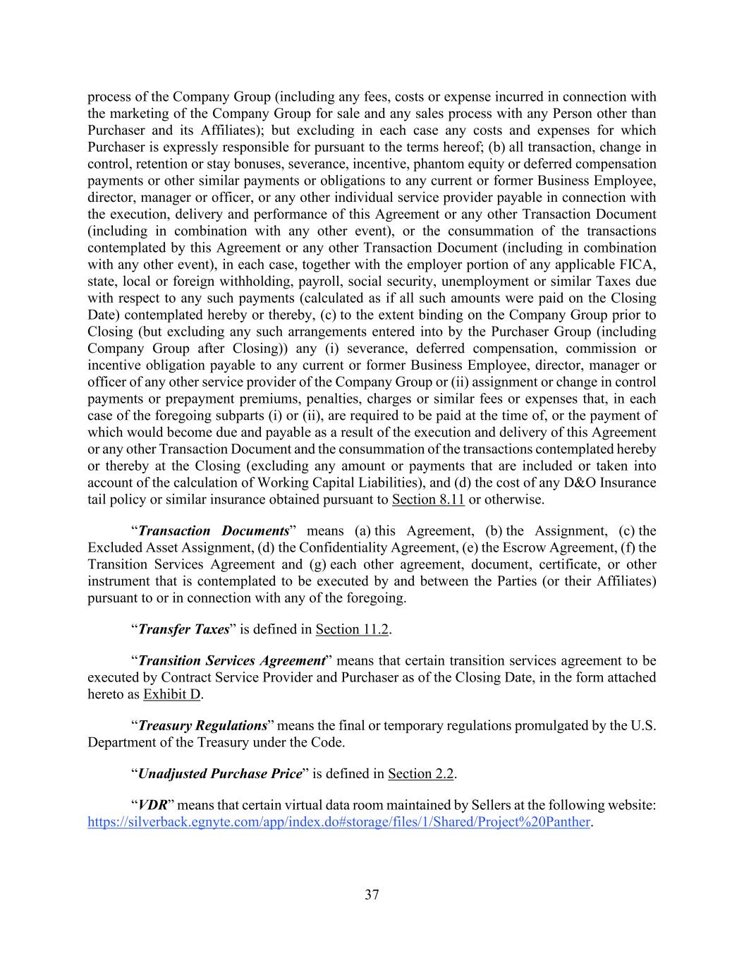 37 process of the Company Group (including any fees, costs or expense incurred in connection with the marketing of the Company Group for sale and any sales process with any Person other than Purchaser and its Affiliates); but excluding in each case any costs and expenses for which Purchaser is expressly responsible for pursuant to the terms hereof; (b) all transaction, change in control, retention or stay bonuses, severance, incentive, phantom equity or deferred compensation payments or other similar payments or obligations to any current or former Business Employee, director, manager or officer, or any other individual service provider payable in connection with the execution, delivery and performance of this Agreement or any other Transaction Document (including in combination with any other event), or the consummation of the transactions contemplated by this Agreement or any other Transaction Document (including in combination with any other event), in each case, together with the employer portion of any applicable FICA, state, local or foreign withholding, payroll, social security, unemployment or similar Taxes due with respect to any such payments (calculated as if all such amounts were paid on the Closing Date) contemplated hereby or thereby, (c) to the extent binding on the Company Group prior to Closing (but excluding any such arrangements entered into by the Purchaser Group (including Company Group after Closing)) any (i) severance, deferred compensation, commission or incentive obligation payable to any current or former Business Employee, director, manager or officer of any other service provider of the Company Group or (ii) assignment or change in control payments or prepayment premiums, penalties, charges or similar fees or expenses that, in each case of the foregoing subparts (i) or (ii), are required to be paid at the time of, or the payment of which would become due and payable as a result of the execution and delivery of this Agreement or any other Transaction Document and the consummation of the transactions contemplated hereby or thereby at the Closing (excluding any amount or payments that are included or taken into account of the calculation of Working Capital Liabilities), and (d) the cost of any D&O Insurance tail policy or similar insurance obtained pursuant to Section 8.11 or otherwise. “Transaction Documents” means (a) this Agreement, (b) the Assignment, (c) the Excluded Asset Assignment, (d) the Confidentiality Agreement, (e) the Escrow Agreement, (f) the Transition Services Agreement and (g) each other agreement, document, certificate, or other instrument that is contemplated to be executed by and between the Parties (or their Affiliates) pursuant to or in connection with any of the foregoing. “Transfer Taxes” is defined in Section 11.2. “Transition Services Agreement” means that certain transition services agreement to be executed by Contract Service Provider and Purchaser as of the Closing Date, in the form attached hereto as Exhibit D. “Treasury Regulations” means the final or temporary regulations promulgated by the U.S. Department of the Treasury under the Code. “Unadjusted Purchase Price” is defined in Section 2.2. “VDR” means that certain virtual data room maintained by Sellers at the following website: https://silverback.egnyte.com/app/index.do#storage/files/1/Shared/Project%20Panther.