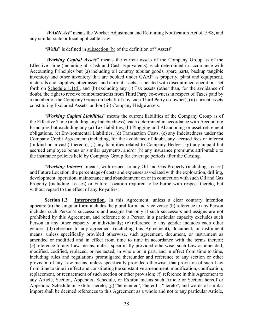 38 “WARN Act” means the Worker Adjustment and Retraining Notification Act of 1988, and any similar state or local applicable Law. “Wells” is defined in subsection (b) of the definition of “Assets”. “Working Capital Assets” means the current assets of the Company Group as of the Effective Time (including all Cash and Cash Equivalents), each determined in accordance with Accounting Principles but (a) including oil country tubular goods, spare parts, backup tangible inventory and other inventory that are booked under GAAP as property, plant and equipment, materials and supplies, other assets and current assets associated with discontinued operations set forth on Schedule 1.1(d), and (b) excluding any (i) Tax assets (other than, for the avoidance of doubt, the right to receive reimbursements from Third Party co-owners in respect of Taxes paid by a member of the Company Group on behalf of any such Third Party co-owner), (ii) current assets constituting Excluded Assets, and/or (iii) Company Hedge assets. “Working Capital Liabilities” means the current liabilities of the Company Group as of the Effective Time (including any Indebtedness), each determined in accordance with Accounting Principles but excluding any (a) Tax liabilities, (b) Plugging and Abandoning or asset retirement obligations, (c) Environmental Liabilities, (d) Transaction Costs, (e) any Indebtedness under the Company Credit Agreement (including, for the avoidance of doubt, any accrued fees or interest (in kind or in cash) thereon), (f) any liabilities related to Company Hedges, (g) any unpaid but accrued employee bonus or similar payments, and/or (h) any insurance premiums attributable to the insurance policies held by Company Group for coverage periods after the Closing. “Working Interest” means, with respect to any Oil and Gas Property (including Leases) and Future Location, the percentage of costs and expenses associated with the exploration, drilling, development, operation, maintenance and abandonment on or in connection with such Oil and Gas Property (including Leases) or Future Location required to be borne with respect thereto, but without regard to the effect of any Royalties. Section 1.2 Interpretation. In this Agreement, unless a clear contrary intention appears: (a) the singular form includes the plural form and vice versa; (b) reference to any Person includes such Person’s successors and assigns but only if such successors and assigns are not prohibited by this Agreement, and reference to a Person in a particular capacity excludes such Person in any other capacity or individually; (c) reference to any gender includes each other gender; (d) reference to any agreement (including this Agreement), document, or instrument means, unless specifically provided otherwise, such agreement, document, or instrument as amended or modified and in effect from time to time in accordance with the terms thereof; (e) reference to any Law means, unless specifically provided otherwise, such Law as amended, modified, codified, replaced, or reenacted, in whole or in part, and in effect from time to time, including rules and regulations promulgated thereunder and reference to any section or other provision of any Law means, unless specifically provided otherwise, that provision of such Law from time to time in effect and constituting the substantive amendment, modification, codification, replacement, or reenactment of such section or other provision; (f) reference in this Agreement to any Article, Section, Appendix, Schedule, or Exhibit means such Article or Section hereof or Appendix, Schedule or Exhibit hereto; (g) “hereunder”, “hereof”, “hereto”, and words of similar import shall be deemed references to this Agreement as a whole and not to any particular Article,