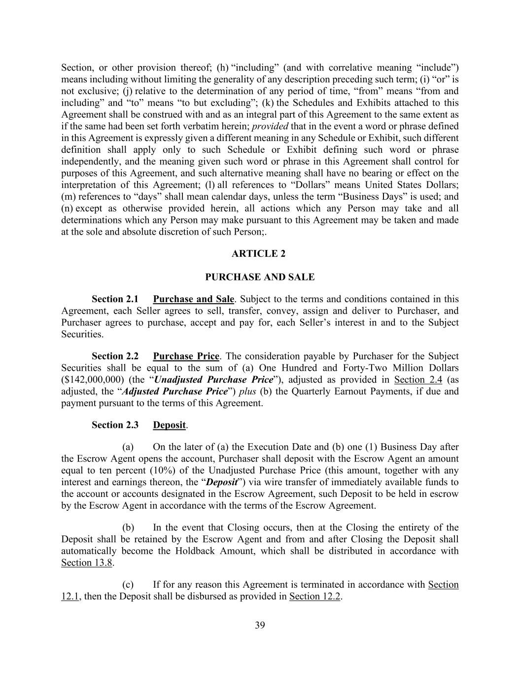 39 Section, or other provision thereof; (h) “including” (and with correlative meaning “include”) means including without limiting the generality of any description preceding such term; (i) “or” is not exclusive; (j) relative to the determination of any period of time, “from” means “from and including” and “to” means “to but excluding”; (k) the Schedules and Exhibits attached to this Agreement shall be construed with and as an integral part of this Agreement to the same extent as if the same had been set forth verbatim herein; provided that in the event a word or phrase defined in this Agreement is expressly given a different meaning in any Schedule or Exhibit, such different definition shall apply only to such Schedule or Exhibit defining such word or phrase independently, and the meaning given such word or phrase in this Agreement shall control for purposes of this Agreement, and such alternative meaning shall have no bearing or effect on the interpretation of this Agreement; (l) all references to “Dollars” means United States Dollars; (m) references to “days” shall mean calendar days, unless the term “Business Days” is used; and (n) except as otherwise provided herein, all actions which any Person may take and all determinations which any Person may make pursuant to this Agreement may be taken and made at the sole and absolute discretion of such Person;. ARTICLE 2 PURCHASE AND SALE Section 2.1 Purchase and Sale. Subject to the terms and conditions contained in this Agreement, each Seller agrees to sell, transfer, convey, assign and deliver to Purchaser, and Purchaser agrees to purchase, accept and pay for, each Seller’s interest in and to the Subject Securities. Section 2.2 Purchase Price. The consideration payable by Purchaser for the Subject Securities shall be equal to the sum of (a) One Hundred and Forty-Two Million Dollars ($142,000,000) (the “Unadjusted Purchase Price”), adjusted as provided in Section 2.4 (as adjusted, the “Adjusted Purchase Price”) plus (b) the Quarterly Earnout Payments, if due and payment pursuant to the terms of this Agreement. Section 2.3 Deposit. (a) On the later of (a) the Execution Date and (b) one (1) Business Day after the Escrow Agent opens the account, Purchaser shall deposit with the Escrow Agent an amount equal to ten percent (10%) of the Unadjusted Purchase Price (this amount, together with any interest and earnings thereon, the “Deposit”) via wire transfer of immediately available funds to the account or accounts designated in the Escrow Agreement, such Deposit to be held in escrow by the Escrow Agent in accordance with the terms of the Escrow Agreement. (b) In the event that Closing occurs, then at the Closing the entirety of the Deposit shall be retained by the Escrow Agent and from and after Closing the Deposit shall automatically become the Holdback Amount, which shall be distributed in accordance with Section 13.8. (c) If for any reason this Agreement is terminated in accordance with Section 12.1, then the Deposit shall be disbursed as provided in Section 12.2.