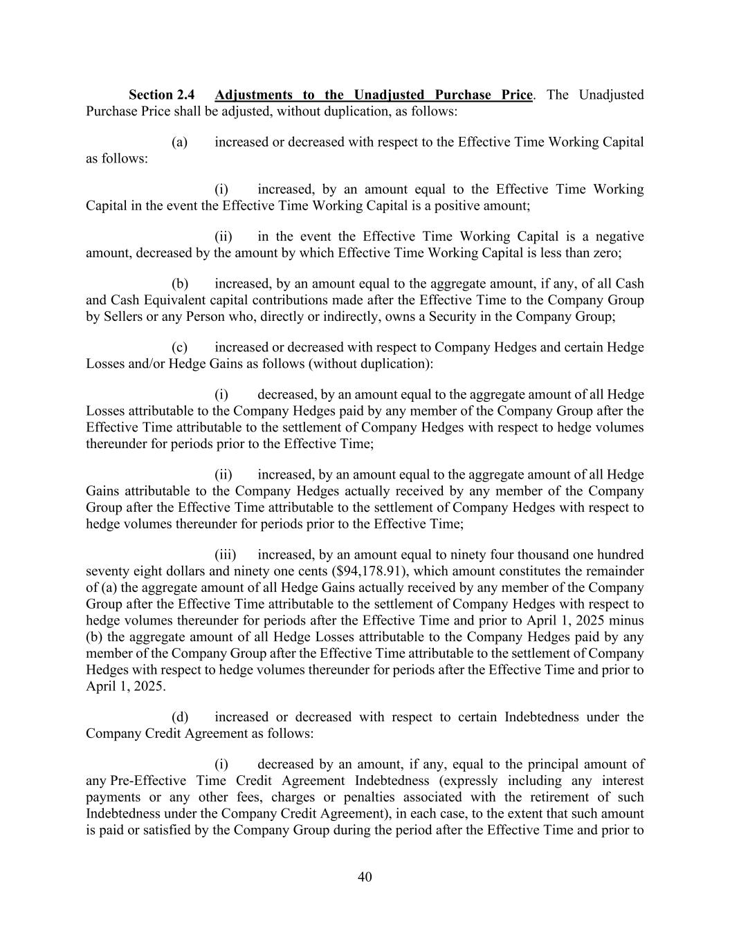 40 Section 2.4 Adjustments to the Unadjusted Purchase Price. The Unadjusted Purchase Price shall be adjusted, without duplication, as follows: (a) increased or decreased with respect to the Effective Time Working Capital as follows: (i) increased, by an amount equal to the Effective Time Working Capital in the event the Effective Time Working Capital is a positive amount; (ii) in the event the Effective Time Working Capital is a negative amount, decreased by the amount by which Effective Time Working Capital is less than zero; (b) increased, by an amount equal to the aggregate amount, if any, of all Cash and Cash Equivalent capital contributions made after the Effective Time to the Company Group by Sellers or any Person who, directly or indirectly, owns a Security in the Company Group; (c) increased or decreased with respect to Company Hedges and certain Hedge Losses and/or Hedge Gains as follows (without duplication): (i) decreased, by an amount equal to the aggregate amount of all Hedge Losses attributable to the Company Hedges paid by any member of the Company Group after the Effective Time attributable to the settlement of Company Hedges with respect to hedge volumes thereunder for periods prior to the Effective Time; (ii) increased, by an amount equal to the aggregate amount of all Hedge Gains attributable to the Company Hedges actually received by any member of the Company Group after the Effective Time attributable to the settlement of Company Hedges with respect to hedge volumes thereunder for periods prior to the Effective Time; (iii) increased, by an amount equal to ninety four thousand one hundred seventy eight dollars and ninety one cents ($94,178.91), which amount constitutes the remainder of (a) the aggregate amount of all Hedge Gains actually received by any member of the Company Group after the Effective Time attributable to the settlement of Company Hedges with respect to hedge volumes thereunder for periods after the Effective Time and prior to April 1, 2025 minus (b) the aggregate amount of all Hedge Losses attributable to the Company Hedges paid by any member of the Company Group after the Effective Time attributable to the settlement of Company Hedges with respect to hedge volumes thereunder for periods after the Effective Time and prior to April 1, 2025. (d) increased or decreased with respect to certain Indebtedness under the Company Credit Agreement as follows: (i) decreased by an amount, if any, equal to the principal amount of any Pre-Effective Time Credit Agreement Indebtedness (expressly including any interest payments or any other fees, charges or penalties associated with the retirement of such Indebtedness under the Company Credit Agreement), in each case, to the extent that such amount is paid or satisfied by the Company Group during the period after the Effective Time and prior to