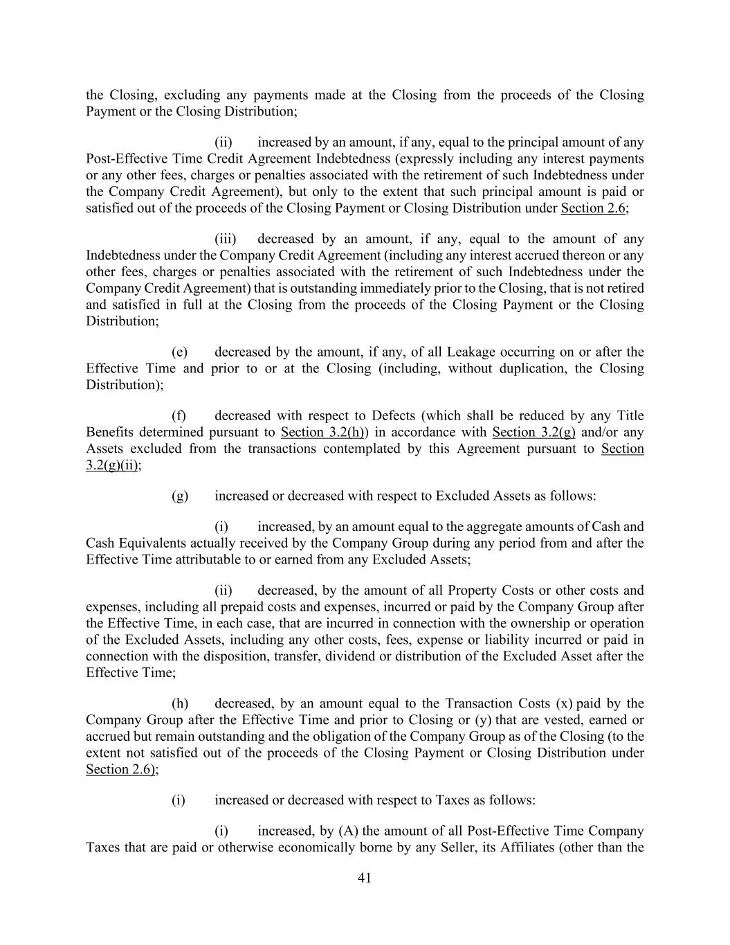 41 the Closing, excluding any payments made at the Closing from the proceeds of the Closing Payment or the Closing Distribution; (ii) increased by an amount, if any, equal to the principal amount of any Post-Effective Time Credit Agreement Indebtedness (expressly including any interest payments or any other fees, charges or penalties associated with the retirement of such Indebtedness under the Company Credit Agreement), but only to the extent that such principal amount is paid or satisfied out of the proceeds of the Closing Payment or Closing Distribution under Section 2.6; (iii) decreased by an amount, if any, equal to the amount of any Indebtedness under the Company Credit Agreement (including any interest accrued thereon or any other fees, charges or penalties associated with the retirement of such Indebtedness under the Company Credit Agreement) that is outstanding immediately prior to the Closing, that is not retired and satisfied in full at the Closing from the proceeds of the Closing Payment or the Closing Distribution; (e) decreased by the amount, if any, of all Leakage occurring on or after the Effective Time and prior to or at the Closing (including, without duplication, the Closing Distribution); (f) decreased with respect to Defects (which shall be reduced by any Title Benefits determined pursuant to Section 3.2(h)) in accordance with Section 3.2(g) and/or any Assets excluded from the transactions contemplated by this Agreement pursuant to Section 3.2(g)(ii); (g) increased or decreased with respect to Excluded Assets as follows: (i) increased, by an amount equal to the aggregate amounts of Cash and Cash Equivalents actually received by the Company Group during any period from and after the Effective Time attributable to or earned from any Excluded Assets; (ii) decreased, by the amount of all Property Costs or other costs and expenses, including all prepaid costs and expenses, incurred or paid by the Company Group after the Effective Time, in each case, that are incurred in connection with the ownership or operation of the Excluded Assets, including any other costs, fees, expense or liability incurred or paid in connection with the disposition, transfer, dividend or distribution of the Excluded Asset after the Effective Time; (h) decreased, by an amount equal to the Transaction Costs (x) paid by the Company Group after the Effective Time and prior to Closing or (y) that are vested, earned or accrued but remain outstanding and the obligation of the Company Group as of the Closing (to the extent not satisfied out of the proceeds of the Closing Payment or Closing Distribution under Section 2.6); (i) increased or decreased with respect to Taxes as follows: (i) increased, by (A) the amount of all Post-Effective Time Company Taxes that are paid or otherwise economically borne by any Seller, its Affiliates (other than the